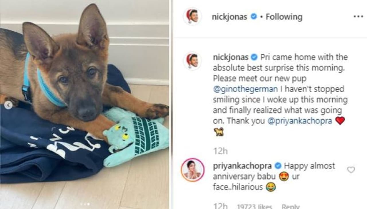 'തികച്ചും സർപ്രൈസായിട്ടുള്ളൊരു സമ്മാനവുമായിട്ടായിരുന്നു പ്രി വന്നത്. ഞങ്ങളുടെ ജിനോയെ കാണു. രാവിലെ എഴുന്നേറ്റത് മുതൽ തനിക്ക് ചിരി നിർത്താൻ സാധിച്ചിട്ടില്ല. താനിപ്പോഴും ചിരിച്ചുക്കൊണ്ടിരിക്കുകയാണ്. നന്ദി', എന്ന അടിക്കുറിപ്പോടെയായിരുന്നു നിക്ക് ജൊനാസ് ചിത്രങ്ങൾ പങ്കുവച്ചത്.