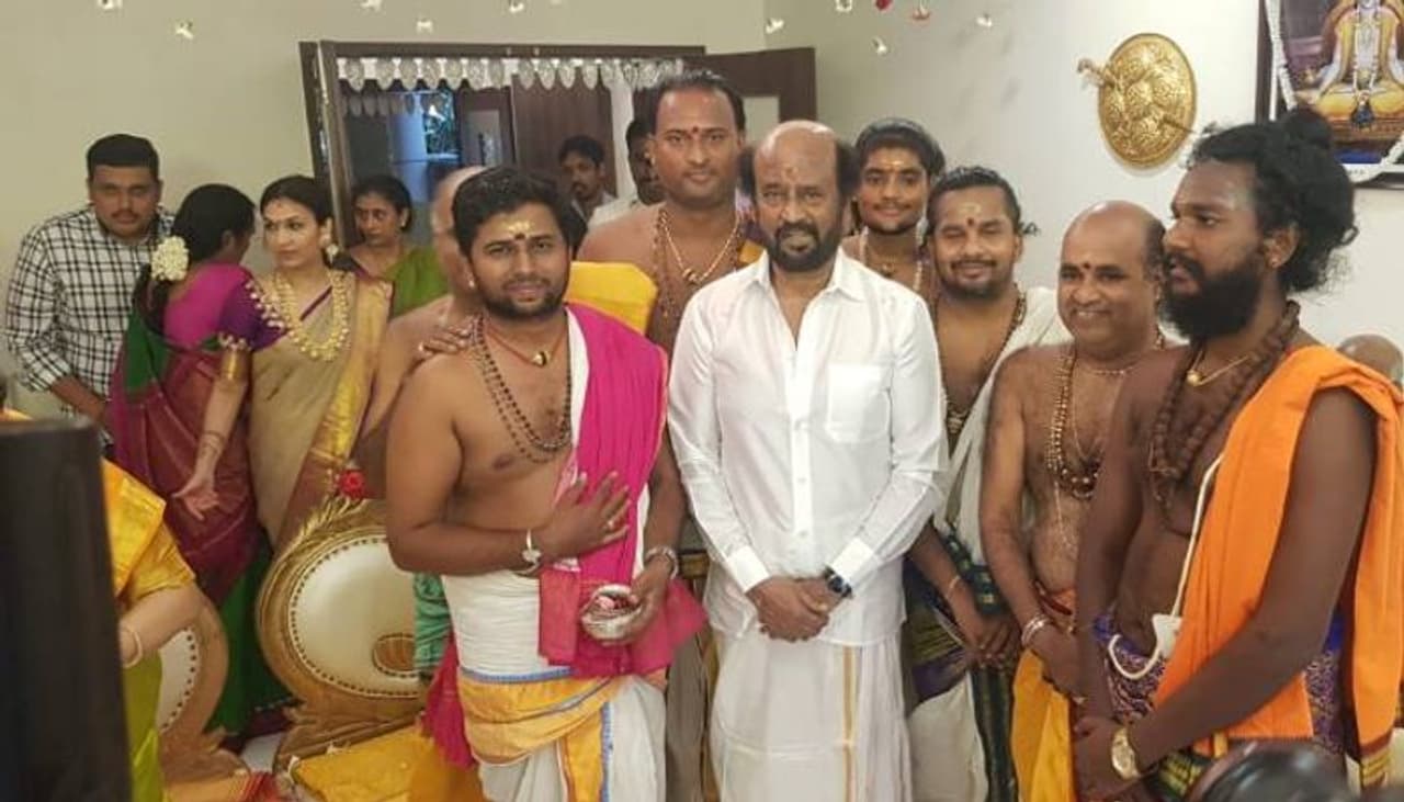 പൂജാദികർമ്മങ്ങളിൽ പങ്കെടുക്കുന്ന രജനിയുടെയും ഭാര്യയുടെയും ചിത്രങ്ങൾ സോഷ്യൽമീഡിയയിൽ വ്യാപകമായി പ്രചരിക്കുന്നുണ്ട്. പൂജയ്ക്കെത്തിയവർക്കൊപ്പം ഫോട്ടോയ്ക്ക് പോസ് ചെയ്യുന്ന തലൈവന്റെ ചിത്രങ്ങളും വൈറലാണ്. പരമ്പരാഗത വസ്ത്രം ധരിച്ചായിരുന്നു അതിഥികളടക്കം ചടങ്ങിൽ പങ്കെടുത്തിരുന്നത്. വെള്ള മുട്ടും ഷർട്ടുമായിരുന്നു രജനിയുടെ വസ്ത്രം. പരമ്പരാഗത കാഞ്ചിപുരം സാരിയാണ് രജനിയുടെ ഭാര്യ ലത രംഗചാരിയും മക്കളായ ഐശ്വര്യയും സൗന്ദര്യയും ധരിച്ചിരുന്നത്.