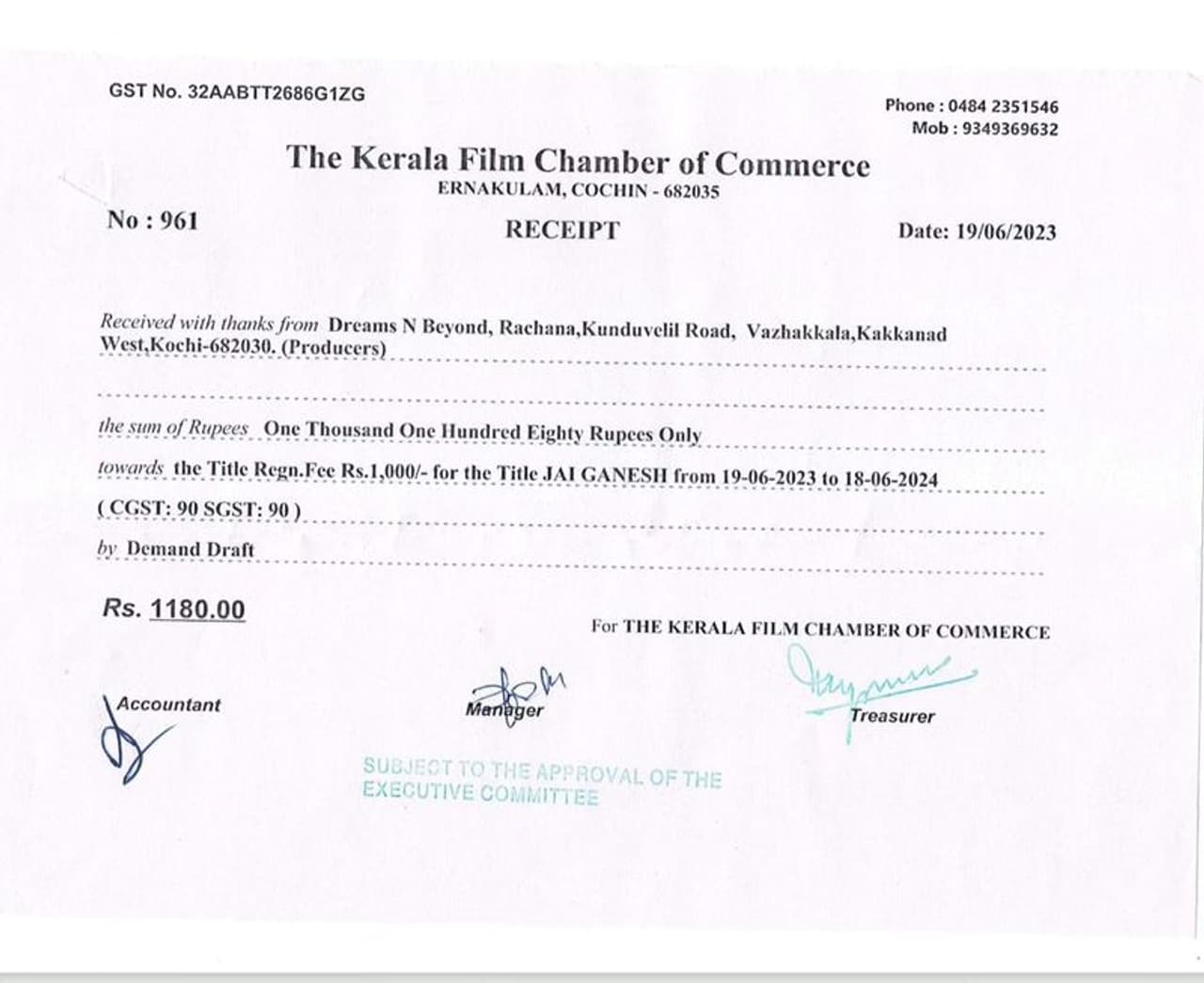 'ജയ് ഗണേഷ്' ടൈറ്റിൽ രജിസ്റ്റർ ചെയ്തതിന്റെ തെളിവും രഞ്ജിത് പങ്കുവച്ചു.