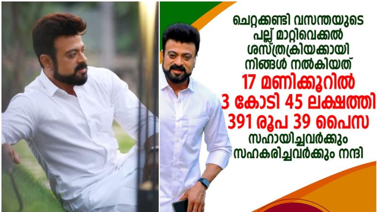 'ചെറ്റക്കണ്ടി വസന്തയുടെ പല്ല് മാറ്റിവെക്കല് ശസ്ത്രക്രിയക്കായി നിങ്ങള് നല്കിയത് 17 മണിക്കൂറില് 3 കോടി 45 ലക്ഷത്തി 391 രൂപ 39 പൈസ, സഹായിച്ചവര്ക്കും സഹകരിച്ചവര്ക്കും നന്ദി' എന്നാണ് ഫസ്റ്റ് ലുക്ക് പോസ്റ്ററിലെ ചിരിയുണര്ത്തുന്ന വാചകം. ഒപ്പം വെള്ള ഷര്ട്ടും മുണ്ടുമണിഞ്ഞ് പുഞ്ചിരിതൂകി നില്ക്കുന്ന റിയാസ് ഖാനുമുണ്ട്.