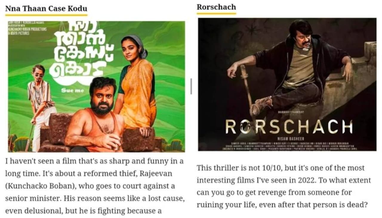 ഫോർബ്സ് പട്ടികയിൽ രണ്ട് മലയാള ചിത്രങ്ങളാണ് ഇടം പിടിച്ചിരിക്കുന്നത്. മമ്മൂട്ടി നായകനായി എത്തിയ 'റോഷാക്കും' കുഞ്ചാക്കോ ബോബൻ നായകനായ 'ന്നാ താൻ കേസ് കൊടും' ആണ് ഈ നേട്ടം കരസ്ഥമാക്കിയിരിക്കുന്നത്. വ്യത്യസ്ത ആഖ്യാനവും കഥ പറച്ചിലുമായി എത്തിയ റോഷാക്ക് സംവിധാനം ചെയ്തത് നിസാം ബഷീർ ആണ്. കുഞ്ചാക്കോ വേറിട്ട ഗെറ്റപ്പിൽ എത്തിയ ന്നാ താൻ കേസ് കൊട് ഒരുക്കിയത് രതീഷ് ബാലകൃഷ്ണ പൊതുവാളും ആണ്.