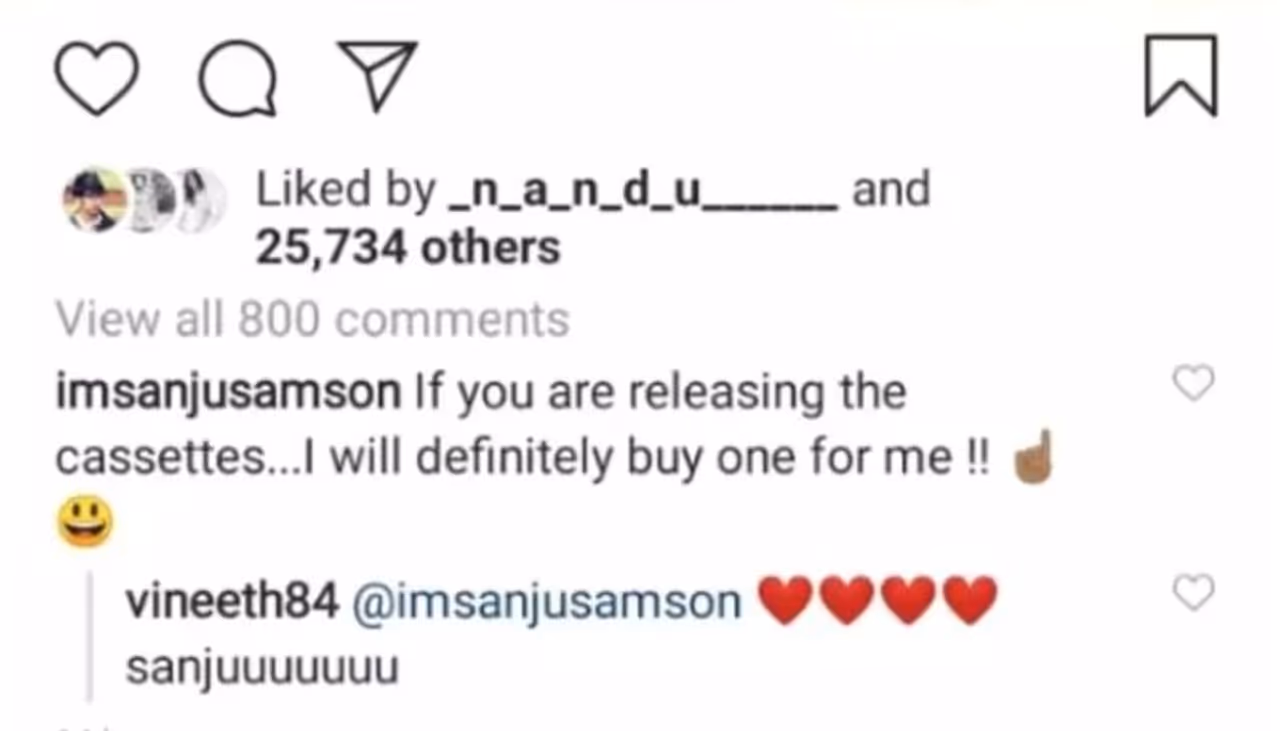 വിനീതിന്റെ പോസ്റ്റിന് പിന്നാലെ മറുപടിയുമായി നിരവധി പേർ രംഗത്തെത്തി. ഭൂരിഭാഗം പേരും പറയുന്നത് കാസറ്റ് പുറത്തിറക്കുന്നത് ഒരിക്കലും വിജയകരമാവില്ല എന്നാണ്. ഇതിനിടയിൽ ക്രിക്കറ്റ് താരം സഞ്ജു സാംസൺ നൽകിയ മറുപടിയാണ് ചർച്ചയാവുന്നത്. “നിങ്ങൾ കാസറ്റുകൾ പുറത്തിറക്കുകയാണെങ്കിൽ ഞാൻ ഒരെണ്ണം ഉറപ്പായും വാങ്ങും“, എന്നായിരുന്നു സഞ്ജു കുറിച്ചത്. നിറയെ ലൗ ചിഹ്നങ്ങൾക്കൊപ്പം സഞ്ജു എന്നായിരുന്നു കമന്റിന് വിനീത് നൽകിയ മറുപടി.