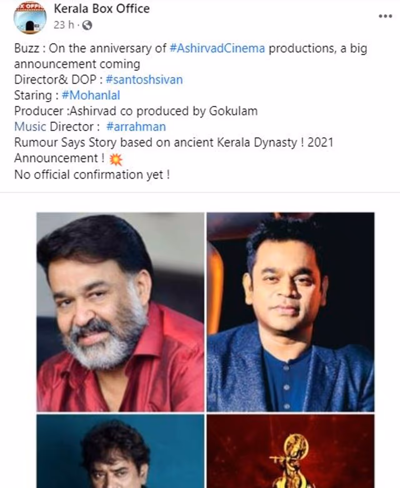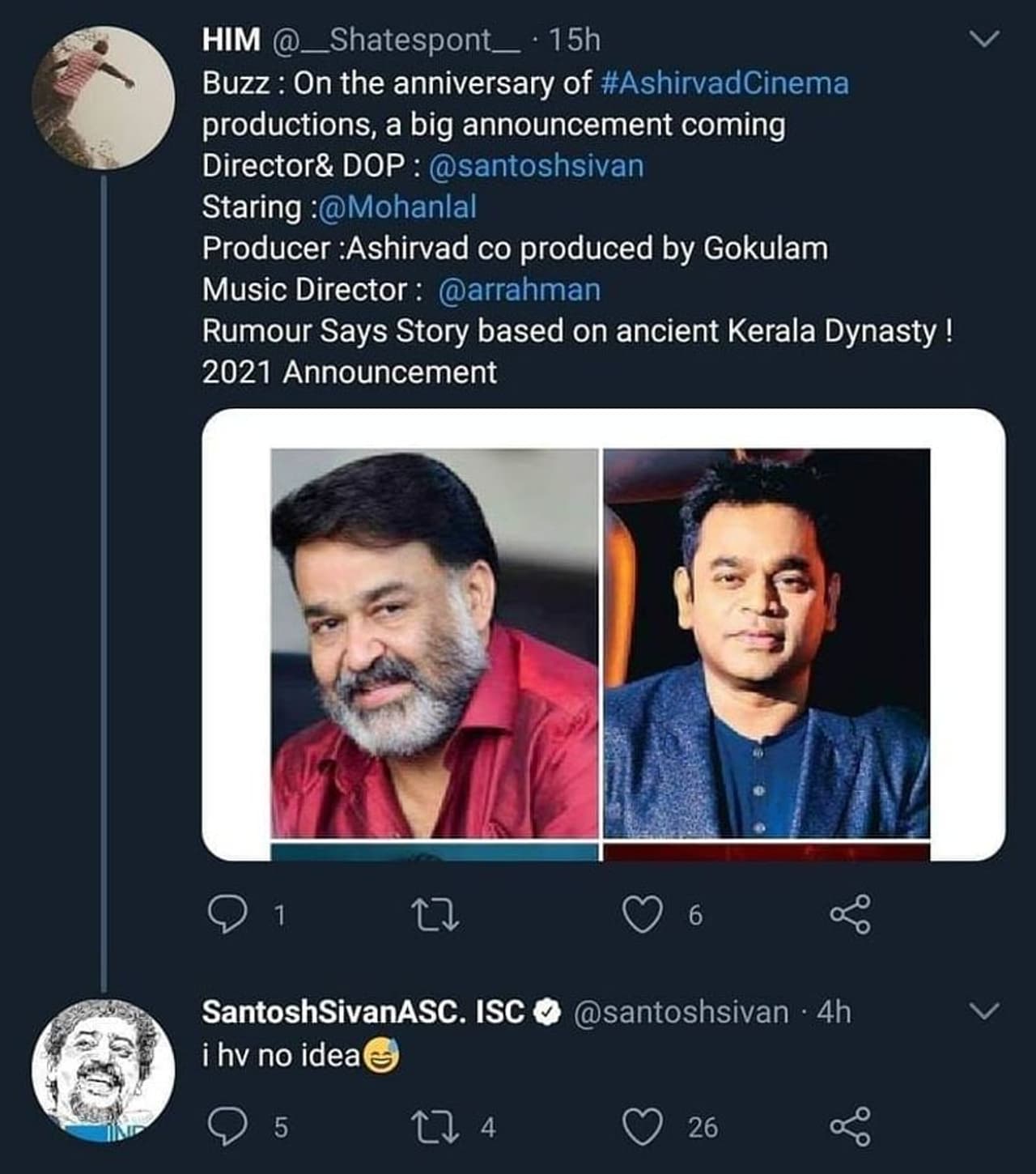 മോഹന്ലാല് നായകനാവുന്ന ഒരു ബിഗ് ബജറ്റ് ചിത്രം സന്തോഷ് ശിവന് സംവിധാനം ചെയ്യാന് ഒരുങ്ങുകയാണെന്ന് സോഷ്യല് മീഡിയയില് ഇന്നലെ മുതല് പ്രചരണമുണ്ട്. ആശിര്വാദ് സിനിമാസ് 20 വര്ഷം പിന്നിടുന്നതു പ്രമാണിച്ചാണ് പുതിയ ബിഗ് ബജറ്റ് പ്രോജക്ട് എന്നും കേരളത്തിലെ ഒരു പഴയ രാജവംശത്തിന്റെ കഥയാവും ചിത്രം പറയുന്നതെന്നും പ്രചരണങ്ങളില് ഉണ്ടായിരുന്നു. സംവിധാനത്തിനൊപ്പം ഛായാഗ്രഹണവും സന്തോഷ് ശിവന് തന്നെ കൈകാര്യം ചെയ്യുന്ന ചിത്രത്തിന്റെ സംഗീത സംവിധാനം എ ആര് റഹ്മാന് ആണെന്നും ഗോകുലം ഗോപാലന്റെ ശ്രീഗോകുലം മൂവീസിനും നിര്മ്മാണ പങ്കാളിത്തമുണ്ടെന്നും ഇതു സംബന്ധിച്ച സോഷ്യല് മീഡിയ പോസ്റ്റുകളില് ഉണ്ടായിരുന്നു. അടുത്ത വര്ഷം ഔദ്യോഗിക പ്രഖ്യാപനം ഉണ്ടാവുമെന്നും. എന്നാല് ഇത്തരത്തിലുള്ള ഒരു ട്വീറ്റിനു ചുവടെ സന്തോഷ് ശിവന് തന്നെ പ്രതികരണവുമായി എത്തി.