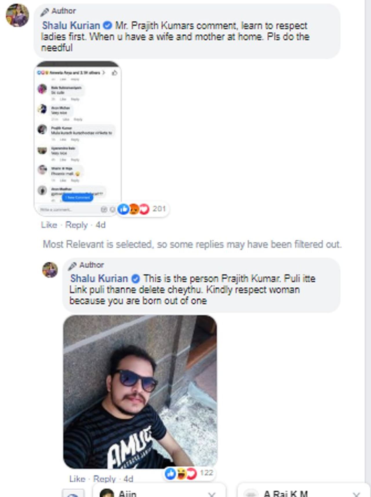 മിസ്റ്റര് പ്രജിത്ത് കുമാര്, സ്ത്രീകളെ ബഹുമാനിക്കാന് പഠിക്കൂ ആദ്യം. നിങ്ങള് ഒരു വീടും ഭാര്യയും അമ്മയും ഒക്കെ ഉള്ളയാളാവുമ്പോള്. ആവശ്യമായത് ചെയ്യുക. പിന്നാലെ കമന്റ് ഡിലീറ്റ് ചെയ്ത പ്രജിത്ത് എന്നയാളെ കുറിച്ചുള്ള വിവരങ്ങളും ഷാലും കമന്റായി ഇട്ടു. പ്രജിത്ത് കുമാര് എന്നാണ് ഇയാളുടെ പേര്. പുള്ളി ഇട്ട ലിങ്ക് പുള്ളി തന്നെ ഡിലീറ്റ് ചെയ്തു. നിങ്ങള് സ്ത്രീകളെ ബഹുമാനിക്കാന് പഠിക്കൂ... കാരണം നിങ്ങളും അവളിലൂടെ വന്നവനാണ്.