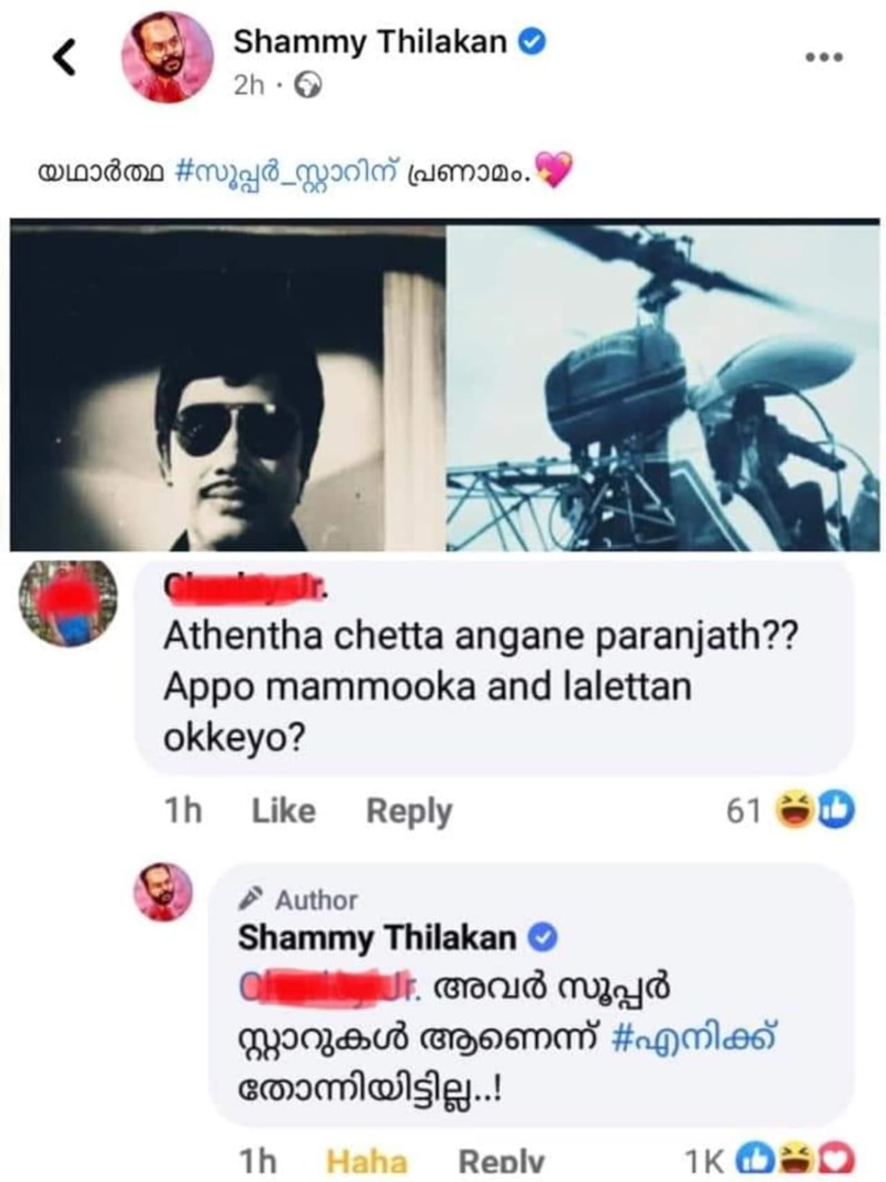 'അതെന്താ ചേട്ടാ അങ്ങിനെ പറഞ്ഞത്, അപ്പോ മമ്മൂക്ക, ലാലേട്ടന് ഒക്കെയോ ? എന്നായിരുന്നു ഒരു കമന്റ്. അവർ സൂപ്പർ സ്റ്റാറുകൾ ആണെന്ന് എനിക്ക് തോന്നിയിട്ടില്ല എന്നായിരുന്നു ഷമ്മി തിലകന്റെ മറുപടി.