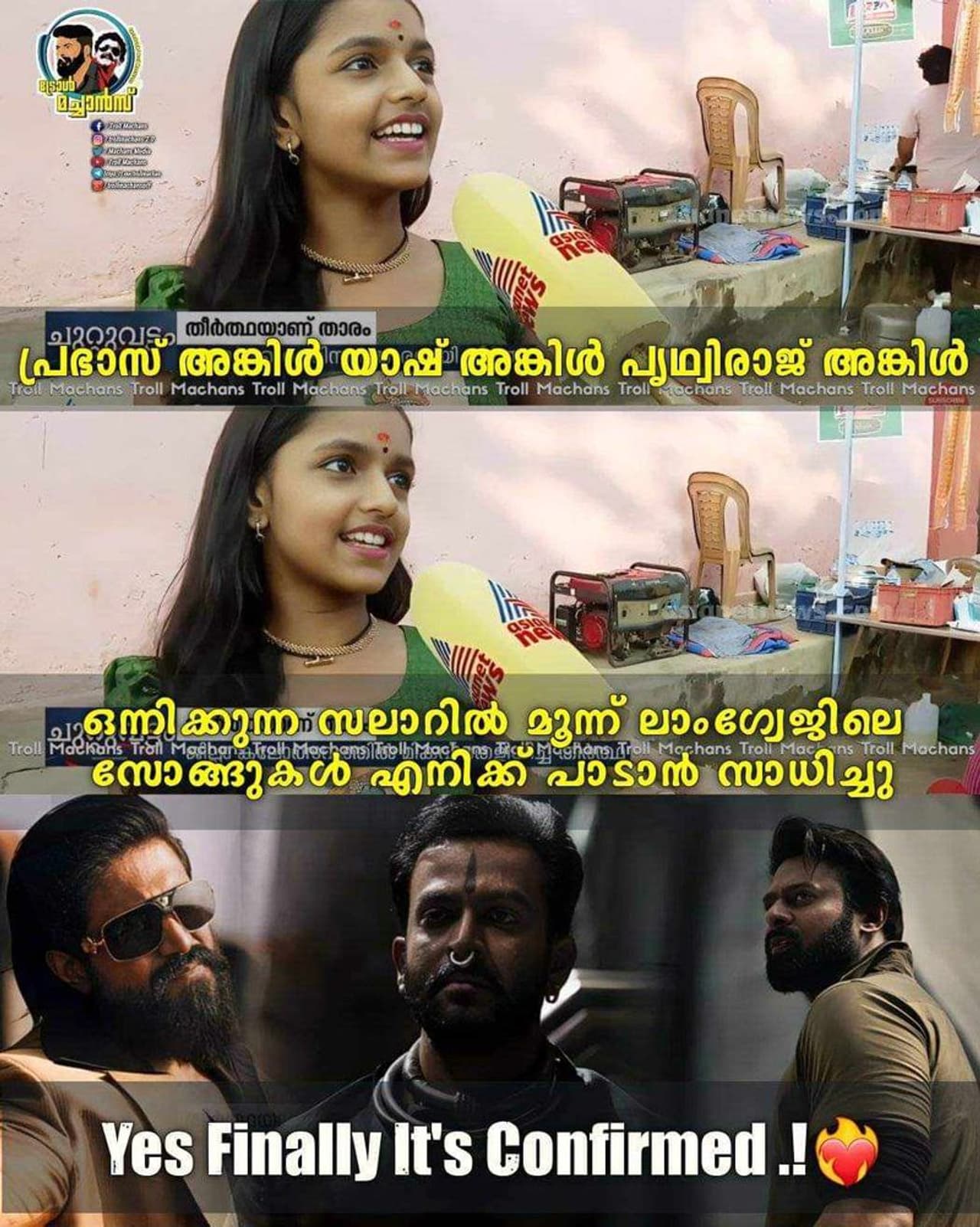"മംഗലാപുരത്ത് വച്ചായിരുന്നു സലാറിന്റെ റെക്കോർഡിംഗ്. അവിടെ പോയപ്പോൾ പ്രശാന്ത് നീൽ, രവി ബസ്റൂർ തുടങ്ങി എല്ലാവരും ഉണ്ടായിരുന്നു. അവള് ഒരുപാട് വട്ടം കെജിഎഫ് കണ്ടിട്ടുണ്ട്. ആ ഓർമയിലാണ് യാഷിന്റെ പേരും പറഞ്ഞത്. മ്യൂസിക് ടീമെല്ലാം കെജിഎഫിന്റേത് ആയത് കൊണ്ട് അവൾക്ക് തെറ്റിപ്പോയതാണ്. കുട്ടിയല്ലേ", എന്നാണ് തീർത്ഥയുടെ മാതാപിതാക്കൾ പറയുന്നത്.