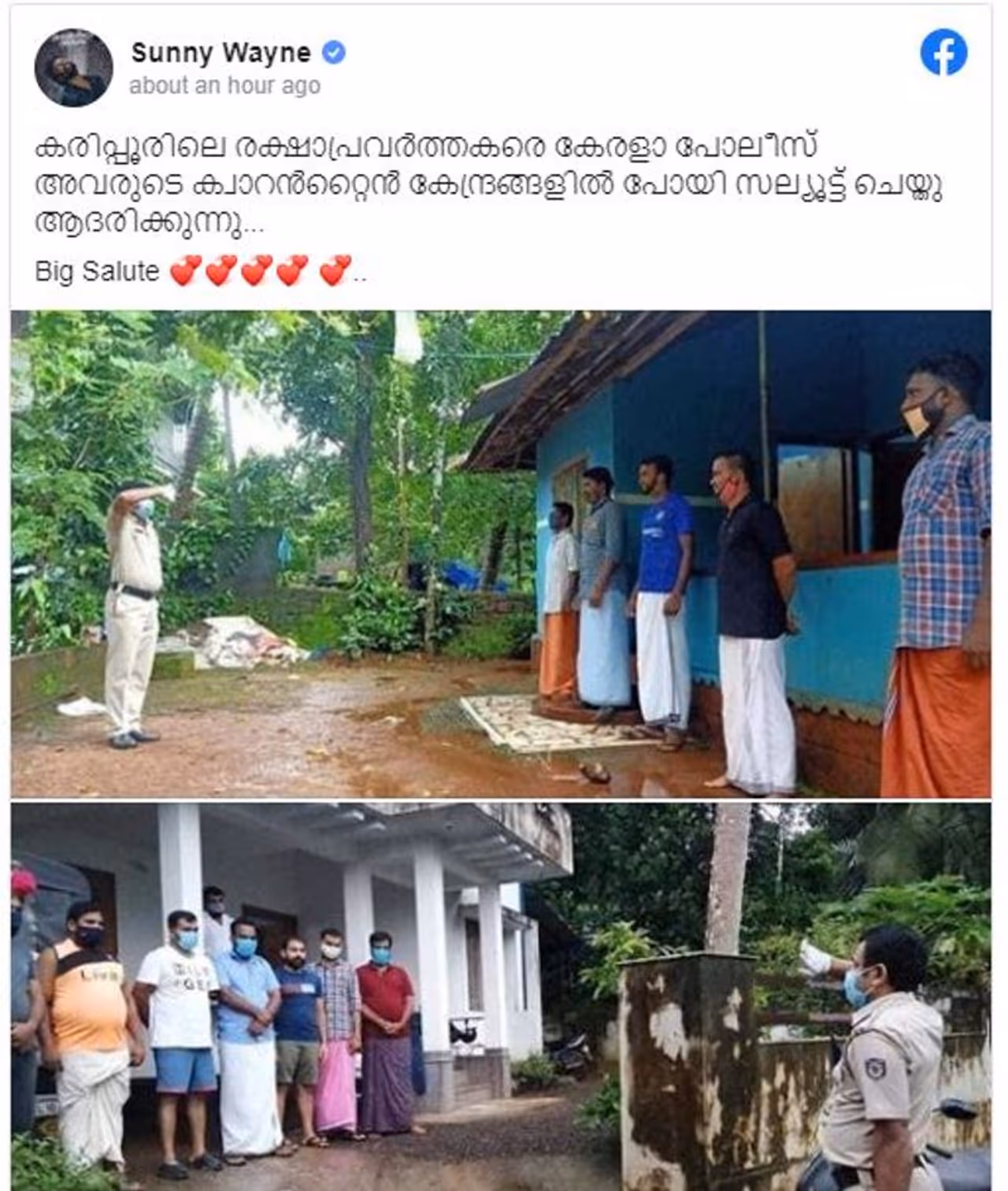 കരിപ്പൂരിലെ ക്വാറൻ്റീൻ കേന്ദ്രത്തിലെത്തി കേരള പൊലീസ് സല്യൂട്ട് ചെയ്യുന്നു എന്നാണ് നടൻ സണ്ണി വെയ്ൻ അടക്കമുള്ളവർ പറയുന്നതെങ്കിലും കരിപ്പൂര് പൊലീസ് ഇത് നിഷേധിച്ചു. കേരളപൊലീസ് അങ്ങനെ സല്യൂട്ട് നല്കാനായി ക്വാറൻ്റീൻ കേന്ദ്രത്തിൽ പോയിട്ടില്ലെന്നും ചിത്രത്തിൻ്റെ വസ്തുത എന്താണെന്ന് അറിയില്ലെന്നും കരിപ്പൂര് പൊലീസ് സ്റ്റേഷനിലെ ഉദ്യോഗസ്ഥർ ഏഷ്യാനെറ്റ് ന്യൂസ് ഓണ്ലൈനിനോട് വ്യക്തമാക്കി. മറ്റേതെങ്കിലും സുരക്ഷാ വിഭാഗത്തിലുള്ളവരാണോ അങ്ങനെ ചെയ്തതെന്ന് അറിയില്ലെന്നും അവര് പറഞ്ഞു.