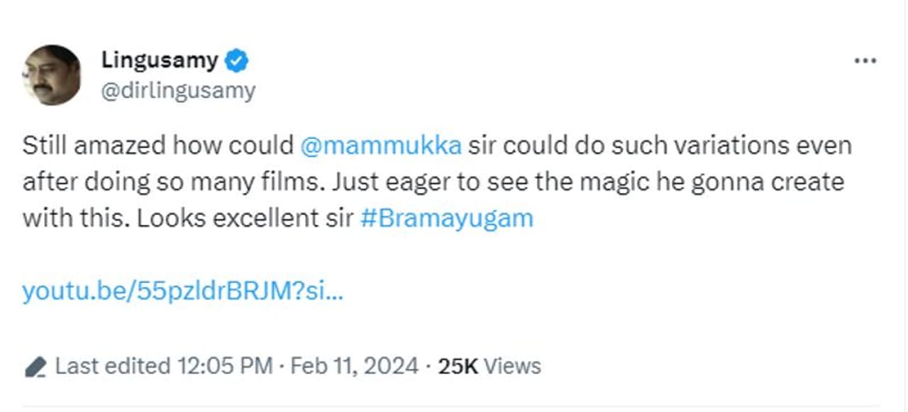 'ഇതിനോടകം ഒട്ടനവധി സിനിമരൾ ചെയ്തിട്ടും മമ്മൂക്ക സാറിന് എങ്ങനെ ഇത്രയും വ്യത്യസ്ത കഥാപാത്രങ്ങൾ ചെയ്യാൻ സാധിക്കുന്നു, അതിൽ ആശ്ചര്യം തോന്നുകയാണ്. അദ്ദേഹം ചെയ്യാൻ പോകുന്ന മാന്ത്രികത കാണാനുള്ള ആകാംക്ഷയിലാണ് ഇപ്പോൾ. ഭ്രമയുഗം ട്രെയിലർ കണ്ടിട്ട് ഗംഭീരമാകുമെന്ന് തോന്നുന്നു സാർ', എന്നാണ് ലിങ്കുസാമി കുറിച്ചത്. ഭ്രമയുഗത്തിന്റെ ലിങ്കും അദ്ദേഹം ഷെയർ ചെയ്തിട്ടുണ്ട്.