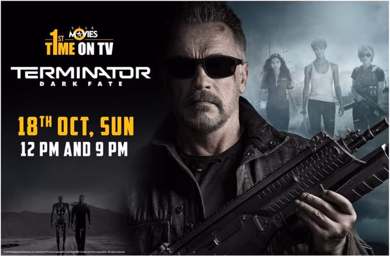 'ടെര്മിനേറ്റര്' ഫ്രാഞ്ചൈസിയിലെ ഏറ്റവും പുതിയ ചിത്രം 'ടെര്മിനേറ്റര് ഡാര്ക് ഫെയ്റ്റി'ന്റെ ഇന്ത്യന് ടെലിവിഷന് പ്രീമിയര് ഞായറാഴ്ച (18). സ്റ്റാര് മൂവീസിലാണ് പ്രദര്ശനം. ഉച്ചയ്ക്ക് 12നും രാത്രി ഒന്പതിനുമായി രണ്ട് പ്രദര്ശനങ്ങളാണ് പ്രീമിയര് ദിനത്തില് ഉള്ളത്.
