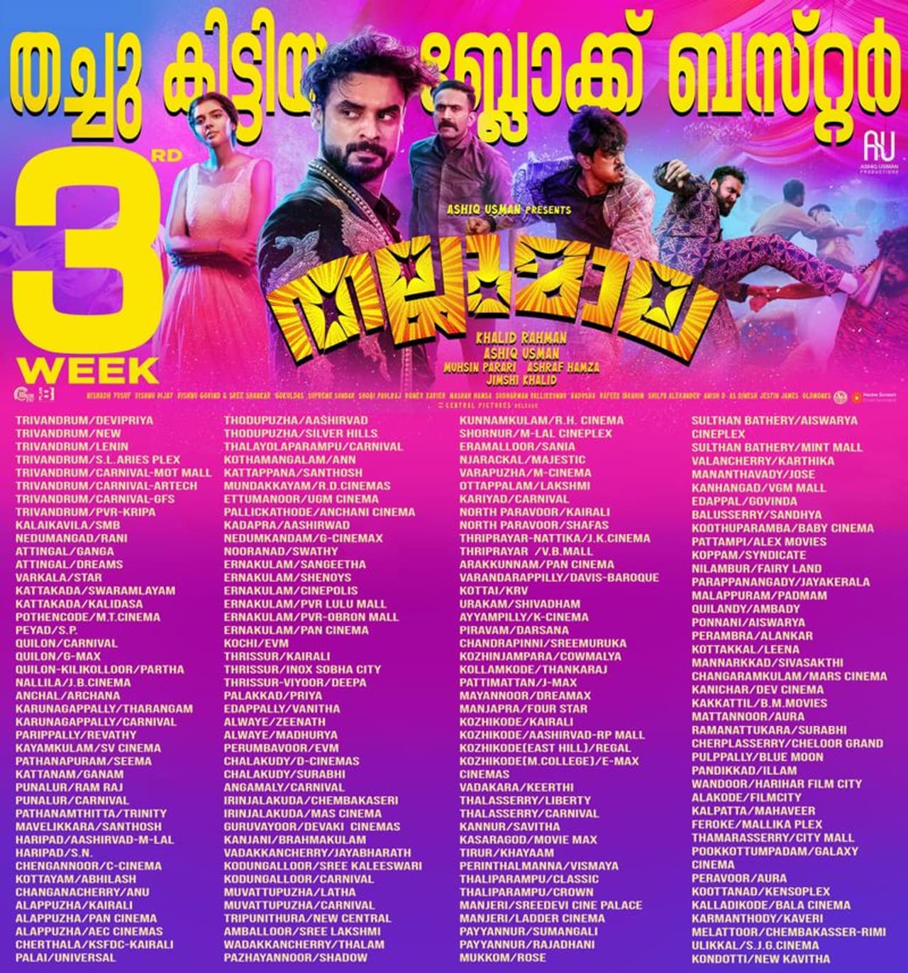 റിലീസ് ചെയ്ത് രണ്ട് വാരം പിന്നിടുമ്പോഴും മികച്ച സ്ക്രീന് കൌണ്ടുമായി ടൊവിനോ തോമസ് നായകനായ തല്ലുമാല. ഓഗസ്റ്റ് 12 ന് തിയറ്ററുകളിലെത്തിയ ചിത്രം കേരളത്തില് മാത്രം 231 സ്ക്രീനുകളിലാണ് റിലീസ് ചെയ്യപ്പെട്ടത്. മൂന്നാം വാരത്തിലേക്ക് പ്രവേശിക്കുമ്പോള് ഇതില് 164 സ്ക്രീനുകളിലും പ്രദര്ശനം തുടരാന് ചിത്രത്തിന് ആയിട്ടുണ്ട്. സമീപകാലത്തൊന്നും ഒരു മലയാള ചിത്രം ഇത്രയും സ്ക്രീനുകളോടെ മൂന്നാം വാരത്തിലേക്ക് പ്രവേശിച്ചിട്ടില്ല.