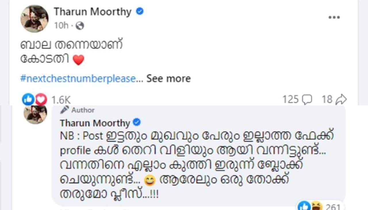 'ബാല തന്നെയാണ് കോടതി. NB : Online/ offline verbal diarrhea കൾക്ക് ഈ നാട്ടിൽ നിയമം ഇല്ലേൽ ഇതൊക്കെ തന്നെയാണ് കോടതി..!!!!', എന്നാണ് തരുൺ മൂർത്തി കുറിച്ചത്. ഒപ്പം #nextchestnumberplease എന്ന ഹാഷ്ടാഗും നൽകിയിട്ടുണ്ട്. പിന്നാലെ നിരവധി പേരാണ് തരുണിനെ അനുകൂലിച്ചും പ്രതികൂലിച്ചും രംഗത്തെത്തിയത്.