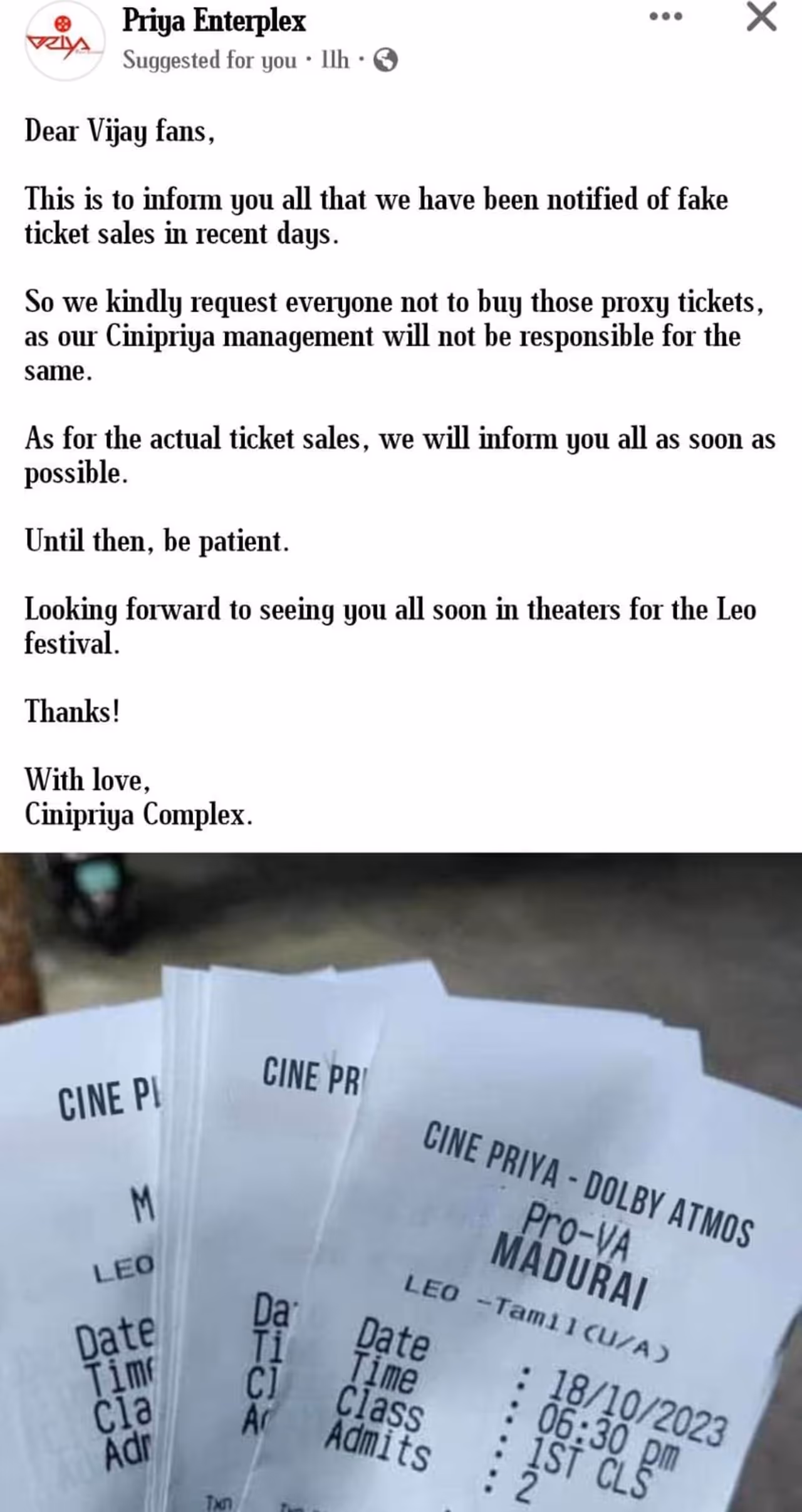 എന്നാല് സോഷ്യല് മീഡിയയില് പ്രചരിക്കുന്ന പുതിയ ചിത്രങ്ങള് പ്രകാരം ലിയോയുടെ 6.30 ഷോയുടെ ടിക്കറ്റുകള് വ്യാപകമായി വില്ക്കപ്പെടുന്നു എന്നു കാണിക്കുന്നത്. മധുരയിലെ പ്രിയ തീയറ്ററിന്റെ പേരിലുള്ള ടിക്കറ്റുകളുടെ ചിത്രമാണ് പ്രചരിക്കുന്നത്. ഇത് വൈറലായതിന് പിന്നാലെ വിജയ് ആരാധകര്ക്ക് ഇത് ഫേക്കാണെന്ന് അറിയിച്ച് പ്രിയ തീയറ്റര് തങ്ങളുടെ സോഷ്യല് മീഡിയ അക്കൌണ്ടില് പോസ്റ്റ് ഇട്ടിട്ടുണ്ട്.