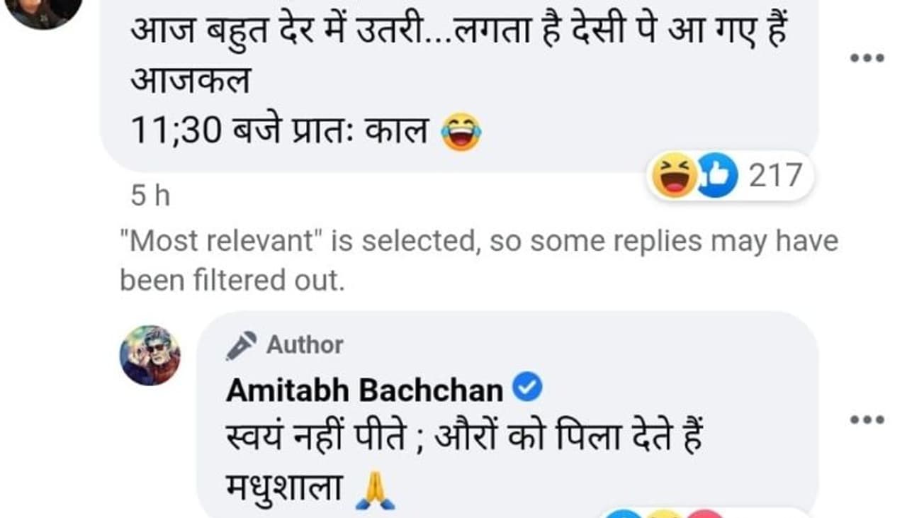 'വൃദ്ധനേ, ഉച്ചയായി' എന്നായിരുന്നു മറ്റൊരാളുടെ കമന്റ്. പ്രായമാകുമ്പോൾ ആരും നിങ്ങളെ ഇതുപോലെ അപമാനിക്കാതിരിക്കട്ടെ എന്ന് ഞാൻ പ്രാർഥിക്കാമെന്നായിരുന്നു അമിതാഭ് ബച്ചൻ നൽകിയ മറുപടി. നിരവധി പേരാണ് താരത്തിന്റെ മറുപടികളെ പിന്തുണച്ച് കൊണ്ട് രംഗത്തെത്തിയത്.
