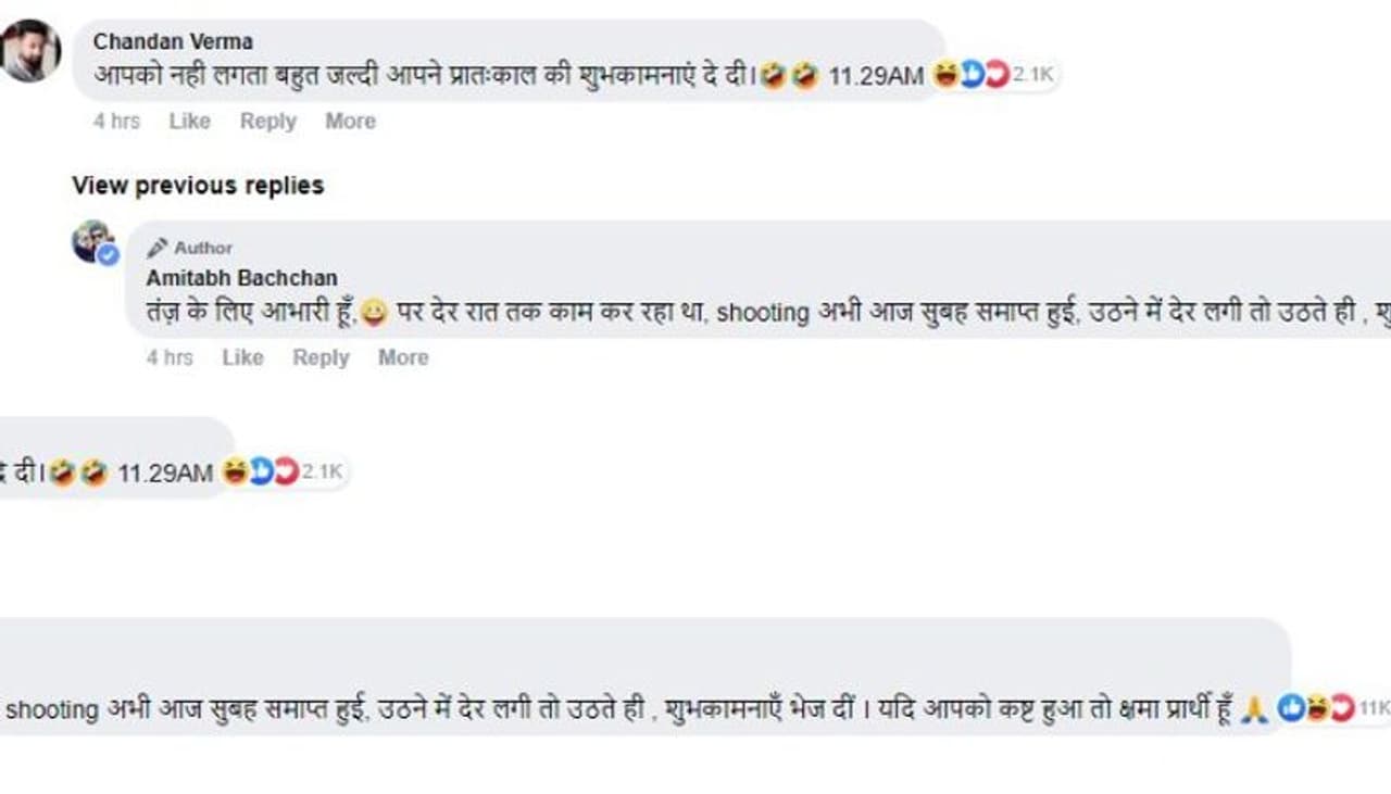കഴിഞ്ഞ ദിവസം വൈകിയായിരുന്നു അമിതാഭ് ബച്ചൻ ഗുഡ് മോണിംഗ് ആശംസിച്ചത്. പിന്നാലെ ചിലർ ട്രോളുകളുമായി പോസ്റ്റിന് താഴെ എത്തി. പരിഹാസങ്ങൾക്കും അധിക്ഷേപങ്ങൾക്കും നന്ദി പറയുന്നു എന്നും രാത്രി ഏറെ നേരം വൈകി ഉറങ്ങിയതിനാൽ ഉണർന്നത് വളരെ താമസിച്ചാണ് എന്നും അതിനാലാണ് ആശംസ വൈകിയതെന്നുമാണ് ഒരാൾക്ക് താരം നൽകിയ മറുപടി.