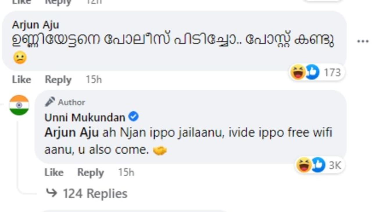 'ഉണ്ണിയേട്ടനെ പൊലീസ് പിടിച്ചോ?', എന്നായിരുന്നു കമന്റ്. 'ഞാനിപ്പോൾ ജയിലിലാണ്. ഇവിടെ ഫ്രീ വൈഫൈ ആണ്. നിങ്ങളും ഇങ്ങോട്ട് വരൂ', എന്നാണ് ഉണ്ണി മുകുന്ദൻ മറുപടി നൽകിയത്. നിരവധി പേരാണ് താരത്തിന്റെ മറുപടിക്ക് പ്രശംസയുമായി രംഗത്തെത്തിയിരിക്കുന്നത്. നൽകിയ മറുപടി കുറച്ചു കൂടിപ്പോയി എന്നും ഇത്ര കടുത്ത ഭാഷയിൽ പറയേണ്ടായിരുന്നു എന്ന് മറ്റൊരു വിഭാഗം ആളുകളും പറയുന്നുണ്ട്.