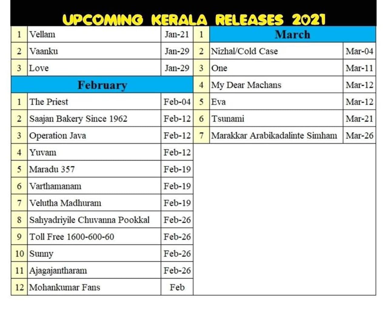 മമ്മൂട്ടിയുടെ 'ദി പ്രീസ്റ്റ്', 'വണ്', കുഞ്ചാക്കോ ബോബന്റെ 'മോഹന് കുമാര് ഫാന്സ്', 'നിഴല്', പൃഥ്വിരാജിന്റെ 'കോള്ഡ് കേസ്' എന്നിവയാണ് ഇക്കൂട്ടത്തിലെ ഏറ്റവും ശ്രദ്ധേയ ചിത്രങ്ങള്. ഈ ചിത്രങ്ങളുടെ 'റിലീസ് തീയതികളും' സോഷ്യല് മീഡിയയില് പ്രചരിക്കുന്നുണ്ട്. എന്നാല് റിലീസിന് തയ്യാറെന്നു പറഞ്ഞ് നിര്മ്മാതാക്കള് തീയേറ്ററുകള്ക്ക് നല്കിയിരിക്കുന്ന തീയതികളാണ് ഇതെന്നും റിലീസ് തീയതികളില് മാറ്റങ്ങള് സംഭവിച്ചേക്കാമെന്നും ഫിയോക് വൈസ് പ്രസിഡന്റ് സോണി തോമസ് ഏഷ്യാനെറ്റ് ന്യൂസ് ഓണ്ലൈനിനോട് പറഞ്ഞു.