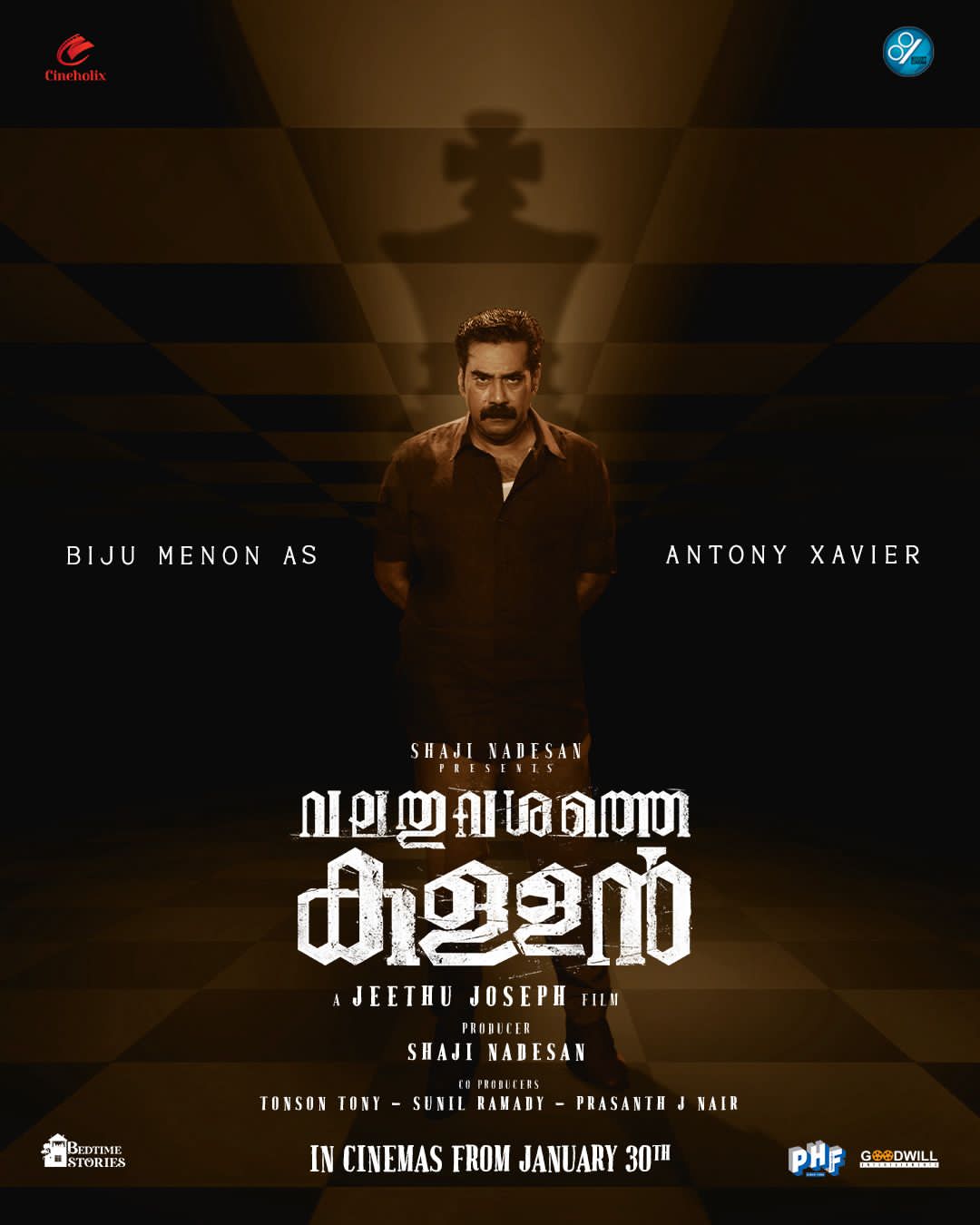 സംവിധായകൻ ജീത്തു ജോസഫ്, ക്രൈം ഡ്രാമ ജോണറിൽ ഒരുക്കുന്ന ഏറ്റവും പുതിയ ചിത്രം 'വലതുവശത്തെ കള്ളൻ' ജനുവരി 30-ന് തിയേറ്ററുകളിൽ എത്താനൊരുങ്ങുകയാണ്. ബിജു മേനോൻ്റേയും ജോജു ജോർജ്ജിൻ്റെയും വേറിട്ട അഭിനയ മുഹൂർത്തങ്ങളുമായാണ് ചിത്രം പുറത്തിറങ്ങുന്നതാണ് ട്രെയിലർ സൂചന നൽകിയിരിക്കുന്നത്. ട്രെയിലർ ഇതിനകം ഏവരും ഏറ്റെടുത്തുകഴിഞ്ഞു. ഇപ്പോഴിതാ ചിത്രത്തിൽ ബിജു മേനോൻ അവതരിപ്പിക്കുന്ന കഥാപാത്രത്തിന്റെ ക്യാരക്ടർ പോസ്റ്റർ പുറത്തിറങ്ങിയിരിക്കുകയാണ്. ആന്റണി സേവ്യർ എന്ന കഥാപാത്രമായാണ് ചിത്രത്തിൽ അദ്ദേഹം എത്തുന്നത്.