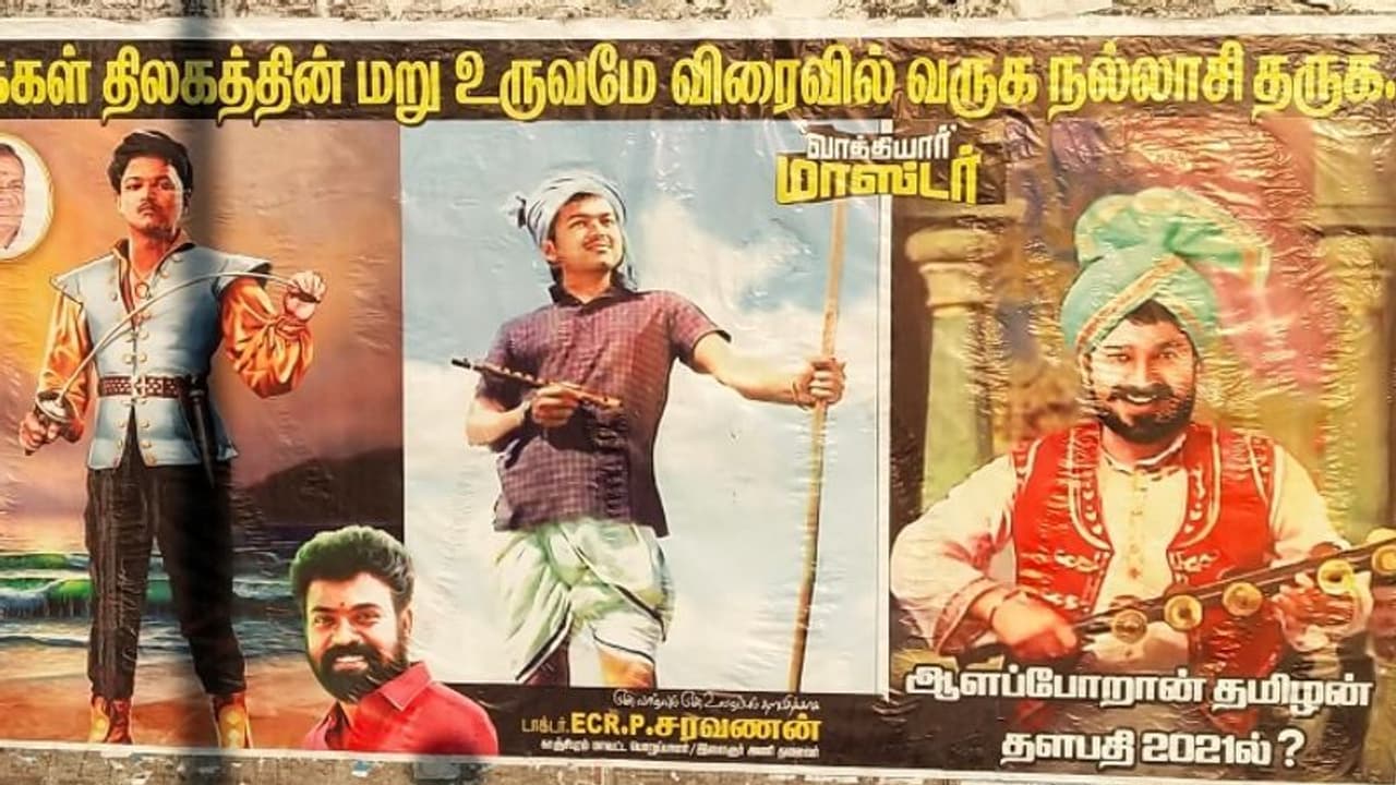തമിഴ്നാടിൻ്റെ നന്മക്കായി ഉടൻ രാഷ്ട്രീയത്തിലേക്ക് ഇറങ്ങണമെന്ന് ആവശ്യപ്പെട്ടാണ് വിജയ് ആരാധകരുടെ പോസ്റ്റർ. എംജിആറിൻ്റെ യഥാർത്ഥ പിൻഗാമിയെന്ന തലക്കെട്ടോടെ എംജിആർ കഥാപാത്രങ്ങളായി ചിത്രീകരിച്ചാണ് പോസ്റ്റർ. കാഞ്ചീപുരം, മധുര, സേലം, രാമനാഥപുരം ഉൾപ്പടെ വിവിധ ഇടങ്ങളിൽ പോസ്റ്റർ പ്രത്യക്ഷപ്പെട്ടു. വിജയ് എംജിആറായും ഭാര്യ സംഗീതയെ ജയലളിതയായും ചിത്രീകരിച്ച് ആഴ്ചകൾക്ക് മുമ്പ് ആരാധകർ പോസ്റ്റർ പതിച്ചിരുന്നു. വിജയ് യുടെ രാഷ്ട്രീയ പ്രവേശനം ഉടൻ എന്ന ഹാഷ് ടാഗോടെ സമൂഹമാധ്യമങ്ങളിലും ചർച്ചകൾ സജീവമാണ്. ആദായനികുതി റെയ്ഡും, ബിജെപിക്കും അണ്ണാഡിഎംകെയ്ക്കും എതിരായ താരത്തിൻ്റെ പ്രസ്താവനകൾ ഉയർത്തി കാട്ടിയാണ് പ്രചാരണം.