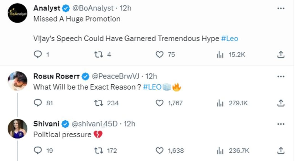 സൂപ്പര്താര തമിഴ് ചിത്രങ്ങളുടെ റിലീസിന് മുന്പുള്ള ഏറ്റവും വലിയ ഇവെന്റ് ആണ് ഓഡിയോ ലഞ്ചുകള്, പ്രത്യേകിച്ചും വിജയ് ചിത്രങ്ങളുടെ. സമീപകാലത്ത് പൊന്നിയിന് സെല്വന്, ജയിലര് തുടങ്ങിയ ചിത്രങ്ങളുടെ ഓഡിയോ ലോഞ്ചുകളും പ്രേക്ഷകാവേശം കൊണ്ട് ശ്രദ്ധ നേടിയിരുന്നു. ജയിലറിന് ശേഷം തമിഴ് സിനിമയില് നിന്നുള്ള ഏറ്റവും വലിയ പ്രീ റിലീസ് ഇവെന്റ് ആവുമെന്ന് കരുതപ്പെട്ടിരുന്ന ലിയോയുടെ ഓഡിയോ ലോഞ്ച് റദ്ദാക്കാനുള്ള നിര്മ്മാതാക്കളുടെ തീരുമാനം വിജയ് ആരാധകരെ ഞെട്ടിച്ചിരിക്കുകയാണ്.