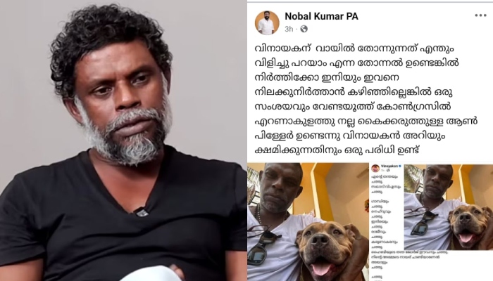 'വിനായകന് വായിൽ തോന്നുന്നത് എന്തും വിളിച്ചു പറയാം എന്ന തോന്നൽ ഉണ്ടെങ്കിൽ നിർത്തിക്കോ. ഇനിയും ഇവനെ നിലക്കുനിർത്താൻ കഴിഞ്ഞില്ലെങ്കിൽ ഒരു സംശയവും വേണ്ട യൂത്ത് കോൺഗ്രസിൽ എറണാകുളത്തു നല്ല കൈക്കരുത്തുള്ള ആൺപിള്ളേർ ഉണ്ടെന്നു വിനായകൻ അറിയും. ക്ഷമിക്കുന്നതിനും ഒരു പരിധി ഉണ്ട്', എന്നായിരുന്നു നോബല് കുമാർ ഫേസ്ബുക്കിൽ കുറിച്ചത്. അന്തരിച്ച നേതാക്കളെ അധിക്ഷേപിച്ചു കൊണ്ടുള്ള വിനായകന്റെ പോസ്റ്റിന് പിന്നാലെ ആണ് നോബല് രംഗത്ത് എത്തിയത്.