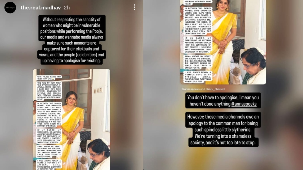 'പൂജ നടത്തുന്ന സ്ത്രീകളുടെ പവിത്രതയെ മാനിക്കാതെ, മാധ്യമങ്ങളും മാധ്യമങ്ങളാകാൻ ശ്രമിക്കുന്നവരും ക്ലിക്ക് ബൈറ്റുകൾക്ക് വേണ്ടിയും കാഴ്ചകൾക്ക് വേണ്ടിയും ഇത്തരം ദൃശ്യങ്ങൾ പകർത്തുകയാണ്. അതുകാരണം നിലനിൽപ്പിന് വേണ്ടി ആളുകൾക്ക് (സെലിബ്രിറ്റികൾ) ക്ഷമാപണം നടത്തേണ്ടി വരുന്നു. അന്നാ.. നിങ്ങൾ മാപ്പ് പറയേണ്ടതില്ല. കാരണം നിങ്ങൾ ഒന്നും ചെയ്തിട്ടില്ല. നട്ടെല്ലില്ലാത്ത സൂത്രശാലിയായ പാമ്പുകളെപ്പോലെ പെരുമാറുന്ന മാധ്യമങ്ങളാണ് മാപ്പ് പറയേണ്ടത്. നാം നാണംകെട്ട സമൂഹമായി മാറിക്കൊണ്ടിരിക്കുകയാണ്. അത് അവസാനിപ്പിക്കാനുള്ള സമയം അതിക്രമിച്ചിരിക്കുന്നു', എന്നാണ് അന്ന രാജന്റെ മാപ്പ് പോസ്റ്റ് പങ്കിട്ട് മാധവ് സുരേഷ് കുറിച്ചത്.