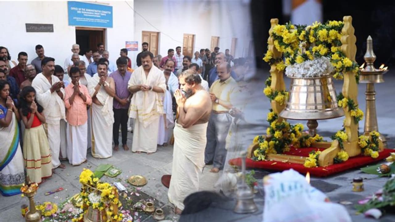 സംവിധായകൻ ബി. ഉണ്ണികൃഷ്ണൻ, നടൻമാരായ സുരേഷ് ഗോപി എം.പി, ഇന്ദ്രൻസ്, തിരക്കഥാകൃത്ത് ബി.ജയമോഹൻ എന്നിവർ ചേർന്ന് സ്വീകരിച്ച മണി സംവിധായകൻ ആർ.എസ് വിമലിന് കൈമാറി. പദ്മനാഭസ്വാമി ക്ഷേത്രം എക്സിക്യൂറ്റീവ് ഓഫീസർ ബി.രതീന്ദ്രൻ ഐ.എ.എസ്, ബബ്നു ശങ്കർ, സി.ആനന്ദകുമാർ, എസ്.പി ദീപക് ഉൾപ്പടെയുള്ളവർ ചടങ്ങിൽ പങ്കെടുത്തു. 2 അടി ഉയരവും 30 കിലോയോളം ഭാരവുമുള്ള മണിയാണ് ഹൈദരാബാദിലെ റാമോജി റാവോ ഫിലിം സിറ്റിയിൽ സജ്ജമാകുന്ന സെറ്റിലേക്ക് കൊണ്ട് പോകുന്നത്. ചിത്രത്തിൽ കർണ്ണന് വേണ്ടി 30 അടി ഉയരമുള്ള പ്രത്യേക രഥമാണ് പ്രധാന ഷൂട്ടിംഗ് ലൊക്കേഷനായ ഹൈദരാബാദിലെ റാമോജി റവോ ഫിലിം സിറ്റിയിൽ ഒരുങ്ങുന്നതെന്ന് സംവിധായകൻ ആർ.എസ് വിമൽ പറഞ്ഞു.