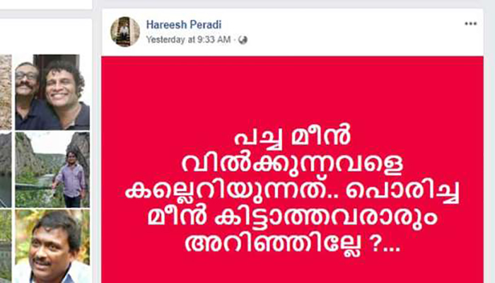 പച്ചമീന് വില്ക്കുന്നവളെ കല്ലെറിയുന്നത്, പൊരിച്ച മീന് കിട്ടാത്തവരാരും അറിഞ്ഞില്ലേ എന്നായിരുന്നു ഹരീഷ് ഫേസ്ബുക്കില് കുറിച്ചത്.