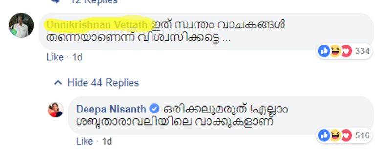 . നിരൂപണം സ്വന്തം വാചകങ്ങൾ തന്നെയാണോ എന്ന് ചോദിച്ചയാൾക്ക് മറുപടിയുമായി അധ്യാപിക ദീപാ നിശാന്ത് നല്കിയത്. ഇത് എന്റെ വാക്കുകളാണെന്ന് വിശ്വസിക്കരുതെന്നും ഇതെല്ലാം ശബ്ദതാരാവലിയിലെ വാക്കുകളാണെന്നും ദീപ നിശാന്ത് പറഞ്ഞു