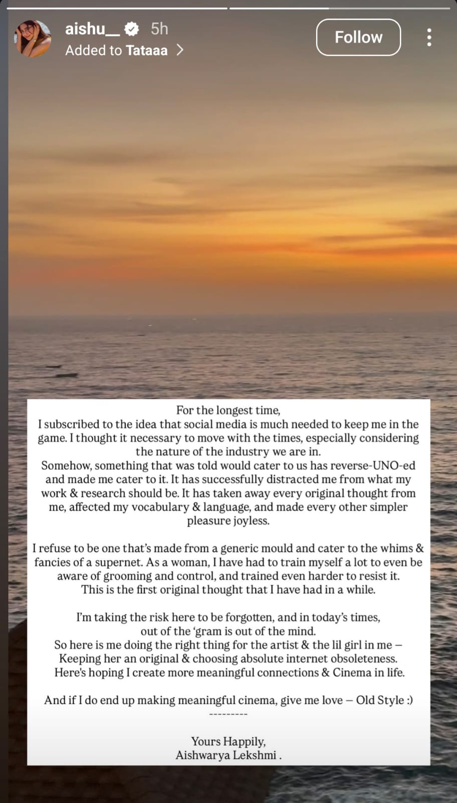 സോഷ്യൽ മീഡിയ ഉപേക്ഷിക്കുന്നത് കുറേ കാലമായി ആലോചിക്കുന്ന ഒരു കാര്യമാണെന്നും, ഇന്നത്തെ കാലത്ത് ഇൻസ്റ്റഗ്രാമിൽ ഇല്ലാത്തവരെ ആളുകൾ പതിയെ മറക്കും എന്നറിയാമെങ്കിലും ആ റിസ്ക് ഏറ്റെടുക്കാൻ താൻ തയ്യാറാണെന്നും ഐശ്വര്യ ലക്ഷ്മി പറയുന്നു. "അതുകൊണ്ട്, എന്നിലെ കലാകാരിയെയും എന്നിലെ കൊച്ചു പെൺകുട്ടിയെയും അവളുടെ നിഷ്കളങ്കതയോടും മൗലികതയോടും നിലനിർത്താൻ പൂർണമായും ഇന്റർനെറ്റിൽ നിന്ന് വിട്ടുനിൽക്കുക എന്ന ശരിയായ കാര്യം ചെയ്യാൻ ഞാൻ തീരുമാനമെടുക്കുകയാണ്. ഇതിലൂടെ എനിക്ക് കൂടുതൽ അർഥവത്തായ ബന്ധങ്ങളും സിനിമയും ജീവിതത്തിൽ ഉണ്ടാക്കാൻ കഴിയുമെന്ന് ഞാൻ പ്രതീക്ഷിക്കുന്നു. ഞാൻ നല്ല സിനിമകൾ ചെയ്യുകയാണെങ്കിൽ എനിക്ക് ഇനിയും പഴയതുപോലെ സ്നേഹം തരാൻ മറക്കരുത്." ഐശ്വര്യ ലക്ഷ്മി കുറിച്ചു.