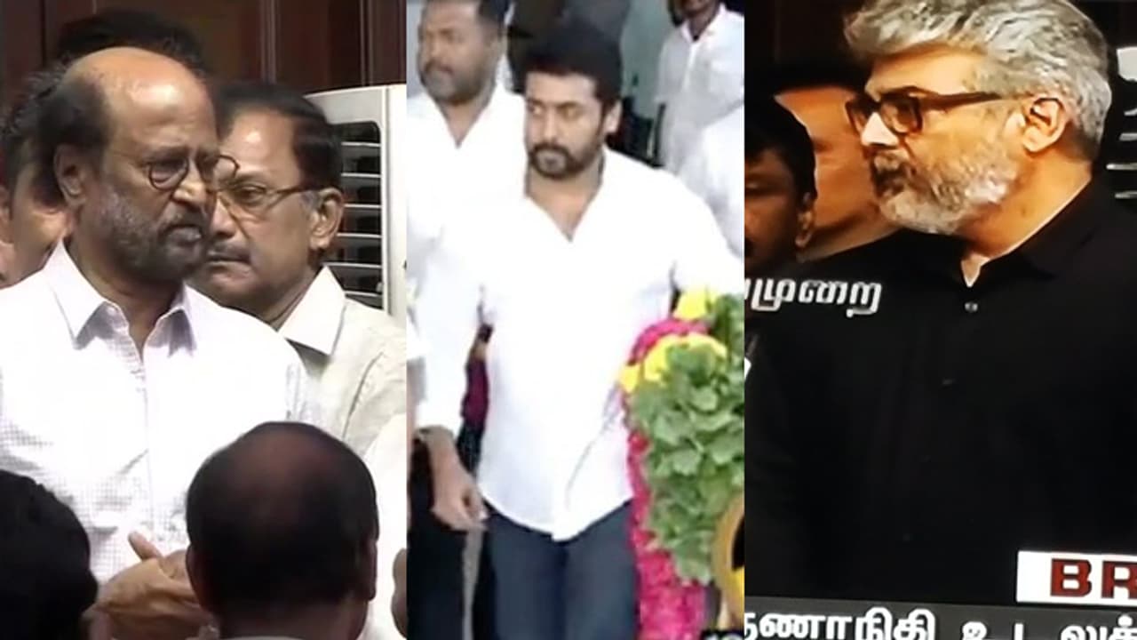 മരണവാര്ത്ത പുറത്തുവന്ന സമയത്ത് ഹൈദരാബാദ് രാമോജി ഫിലിം സിറ്റിയില് ശിവ സംവിധാനം ചെയ്യുന്ന വിശ്വാസത്തിന്റെ ചിത്രീകരണത്തിലായിരുന്നു അജിത്ത് കുമാര്. വിവരമണിഞ്ഞയുടന് അദ്ദേഹം ചെന്നൈയിലേക്ക് പുറപ്പെടുകയായിരുന്നു. നടികര് സംഘം ജനറല് സെക്രട്ടറിയും തമിഴ് ഫിലിം പ്രൊഡ്യൂസേഴ്സ് കൗണ്സില് പ്രസിഡന്റുമായ നടന് വിശാല് ട്രിച്ചിയില് ചിത്രീകരണത്തിലായിരുന്നു. അദ്ദേഹവും ഇന്നലെത്തന്നെ ഷൂട്ടിംഗ് നിര്ത്തിവച്ച് ചെന്നൈയിലേക്ക് തിരിച്ചു. #Marina4Kalaignar ക്യാംപെയ്നിലും വിശാല് പങ്കെടുത്തു.