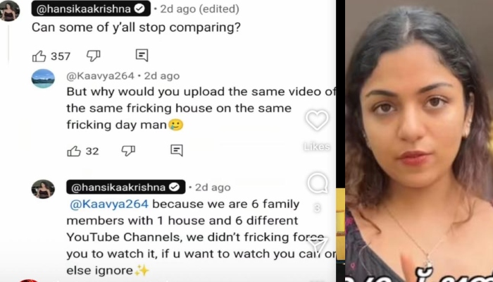 നിങ്ങൾക്ക് താരതമ്യം ചെയ്യാതിരിക്കാമോ എന്നാണ് വ്ളോഗിന് താഴെ ഹൻസിക കമന്റ് ചെയ്തത്. എന്തിനാണ് ഒരേ ദിവസം ഒരേ വീഡിയോ പങ്കുവച്ചത് എന്ന കമന്റിനും ഹൻസിക മറുപടി നൽകി. ''ഞങ്ങൾ വെവ്വേറെ യുട്യൂബ് ചാനലുകളുള്ള, ഒരേ വീട്ടിൽ താമസിക്കുന്ന ആറ് കുടുംബാംഗങ്ങൾ ആണ്. നിങ്ങളെ കാണാൻ നിർബന്ധിക്കുന്നില്ല. കാണണം എന്നുണ്ടെങ്കിൽ കാണൂ, ഇല്ലെങ്കിൽ അവഗണിക്കൂ'', എന്നായിരുന്നു വിമർശനങ്ങളോട് ഹൻസികയുടെ മറുപടി.