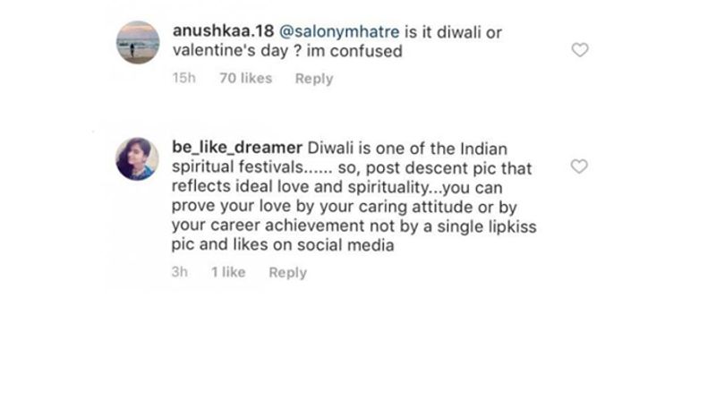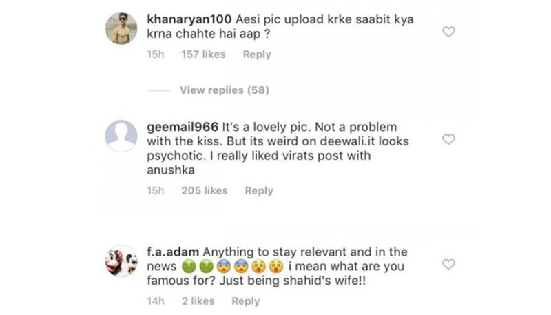 എന്നാല് ചിലരാകട്ടെ ഇരുവരും ചുംബിക്കുന്ന ചിത്രത്തെ ട്രോളി രംഗത്തെത്തി. ഇരുവരും ഇന്ത്യന് സംസ്കാരം മറന്നുവെന്നാണ് ഇവരുടെ ആരോപണം. വിരാട് കോലിയോടും അനുഷ്ക ശര്മ്മയോടും താരതമ്യപ്പെടുത്തിയാണ് ചിലര് മിറയെയും ഷാഹിദിനെയും പരിഹസിച്ചത്. വിരാടും അനുഷ്കയും മാന്യമായ ചിത്രമാണ് പങ്കുവച്ചതെന്നും ഇവര് പറയുന്നു. ഇത് ദീപാവലിയോ വാലന്റൈന്സ് ഡേയോ എന്നും ചിലര് ചോദിക്കുന്നു.