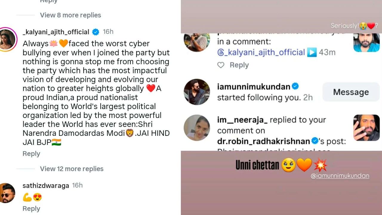ഇതിനിടെ നടൻ ഉണ്ണി മുകുന്ദൻ, കല്യാണിയെ ഇൻസ്റ്റാഗ്രാമിൽ ഫോളോ ചെയ്തിരിക്കുകയാണ്. കല്യാണി തന്നെയാണ് ഈ സന്തോഷം പങ്കുവച്ചിരിക്കുന്നതും. 2025 ഡിസംബർ 15ന് ആയിരുന്നു കല്യാണി ബിജെപിയിൽ ചേർന്നത്. മികച്ചൊരു തീരുമാനം എന്നായിരുന്നു കല്യാണി അന്ന് കുറിച്ചത്. തിരുവനന്തപുരം പേരൂർക്കട സ്വദേശിനിയാണ് കല്യാണി.