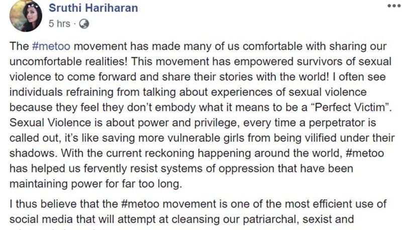 എന്റെ സ്വപ്നങ്ങളെ എത്തിപ്പിടിക്കാന് സഹായിച്ചിട്ടുള്ള വൈവിധ്യങ്ങളായ അവസരം നല്കുകയും ചെയ്തിട്ടുള്ള ഒരു തൊഴിലിടമായിരു്നനു സിനിമ. എന്നാല് അതിഭീകരമായി അപമാനിക്കപ്പെട്ടതായും പേടിക്കുകയും സുരക്ഷിതയല്ലെന്നും തോന്നുന്ന രീതിയിലുള്ള പെരുമാറ്റം നടന് അര്ജുനില് നിന്ന് ഉണ്ടായിയെന്ന് ശ്രുതി ഹരിഹരന് ഫേസ്ബുക്കില് വിശദമാക്കുന്നു. അവസരം തേടിയെത്തുമ്പോള് മുതല് നേരിടുന്ന ഒരു വാക്കാണ് സഹകരിക്കു ഇല്ലെങ്കില് അവസരം മറ്റൊരാള്ക്ക് നല്കുമെന്നതെന്നും ശ്രുതി പറയുന്നു. എന്നാല് അത്തരം അതിക്രമങ്ങള് ഒന്നും നേരിടാതെയാണ് സിനിമയില് തനിക്ക് എവസരം കിട്ടിയതെന്നും നടി പറയുന്നു. എന്നാല് 2016 ന്റെ അവസാനത്തോടെയാണ് ഞെട്ടിക്കുന്ന രീതിയിലുള്ള പ്രതികരണം മുതിര്ന്ന നടനായി അര്ജുനില് നിന്ന് ഉണ്ടായത്. ആ ഞെട്ടലില് നിന്ന് വിമുക്തയാവാന് ഏറെ സമയമെടുത്തെന്നും ശ്രുതി പറയുന്നു.