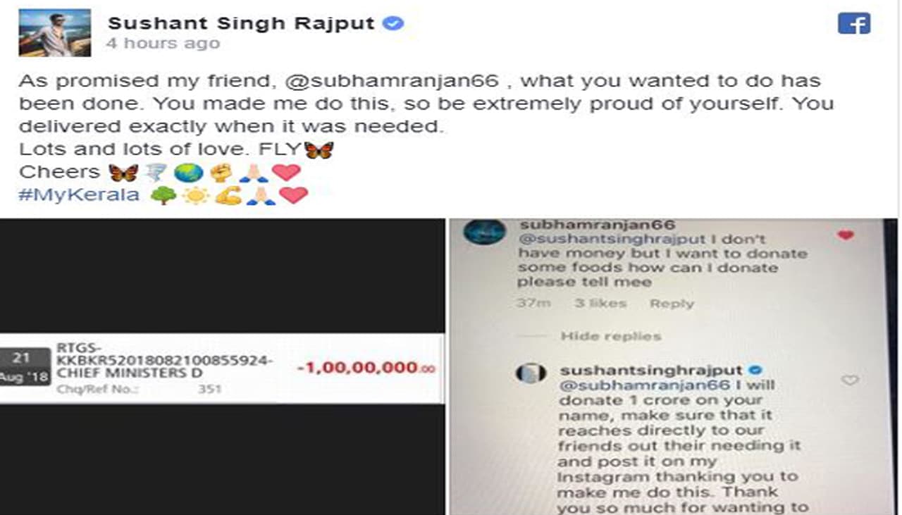 ആരാധകനെ ഞെട്ടിച്ച് യുവ ബോളിവുഡ് നടന് സുശാന്ത് സിംഗ് രജ്പുത്. കേരളത്തെ അക്ഷരാര്ത്ഥത്തില് തകര്ത്തു കളഞ്ഞ പ്രളയത്തില് ദുരിതം അനുഭവിക്കുന്നവരെ സഹായിക്കാന് ആഗ്രഹമുണ്ടായിട്ടും അതിന് പണമില്ലെന്ന് പരിതപിച്ച ആരാധകനെയാണ് സുശാന്ത് ഞെട്ടിച്ചിരിക്കുന്നത്.