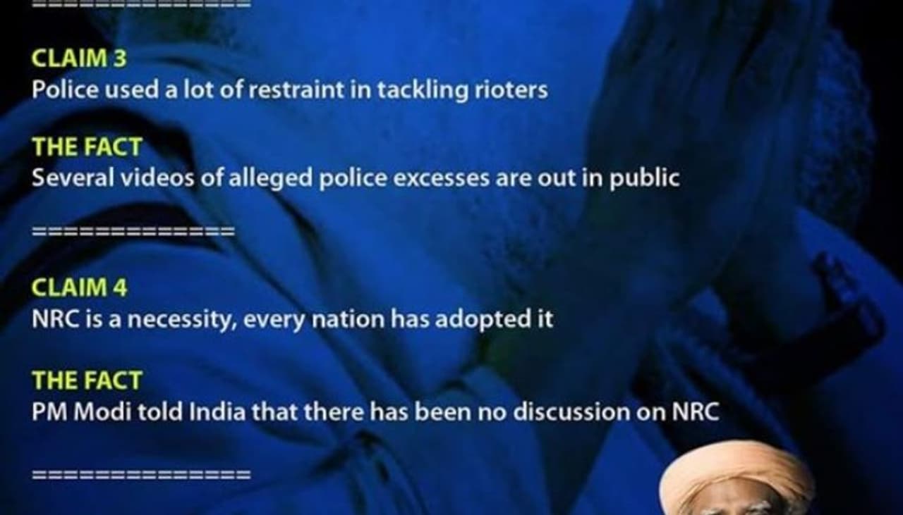 ടൈംസ് നൗ പറയുന്നത്- എന്ആര്സിയുടെ കാര്യത്തില് ഇതുവരെ ചര്ച്ചകളൊന്നും നടന്നിട്ടില്ല എന്നാണ് പ്രധാനമന്ത്രി നരേന്ദ്ര മോദി വ്യക്തമാക്കിയത്.