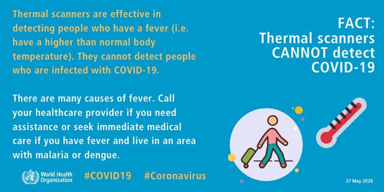'പനിയുള്ളവരെ(അതായത് ശരാശരി ശരീര താപനിലയ്ക്ക് മുകളിലുള്ളവരെ) തിരിച്ചറിയാനാണ് തെല്മല് സ്കാനറുകള് ഉപയോഗിക്കുന്നത്. കൊവിഡ് 19 ബാധിച്ച ആളുകളെ കണ്ടെത്താന് ഇവയ്ക്ക് കഴിയില്ല'.