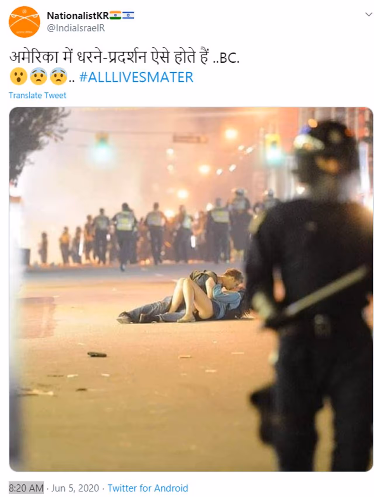 പ്രതിഷേധത്തിനിടെ യുവ കമിതാക്കള് റോഡില് കിടന്ന് ചുംബിക്കുന്നതാണ് ചിത്രത്തില്. ജോര്ജ് ഫ്ലോയ്ഡിന്റെ നീതിക്കായുള്ള പ്രതിഷേധത്തിനിടയില് പകര്ത്തിയ ചിത്രമാണ് ഇതെന്നാണ് പ്രചാരണങ്ങള്. 'അമേരിക്കയില് ഇങ്ങനെയാണ് പ്രതിഷേധങ്ങള്' എന്ന കുറിപ്പോടെ ട്വിറ്ററില് പ്രത്യക്ഷപ്പെട്ട ചിത്രം ചുവടെ. #ALLLIVESMATTER എന്ന ഹാഷ്ടാഗോടെ ആയിരുന്നു ട്വീറ്റ്.