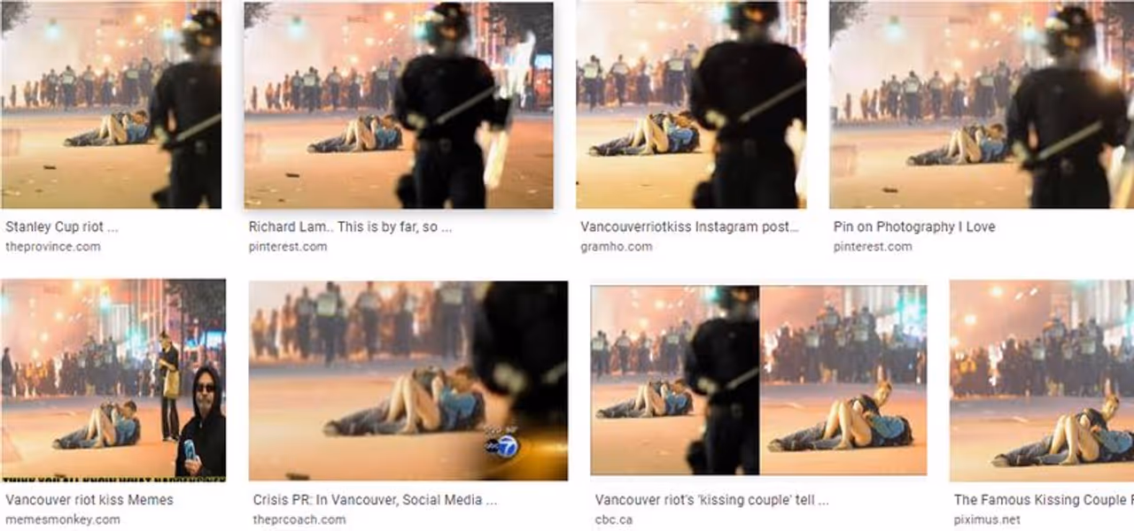 ഈ ചിത്രം 2011ല് കാനഡയിലെ വാൻകൂവറില് നിന്ന് പകര്ത്തിയതാണ് എന്ന് റിവേഴ്സ് ഇമേജ് സെര്ച്ചില് വ്യക്തമായി. രണ്ട് ഐസ് ഹോക്കി ടീമുകളുടെ ആരാധകര് തമ്മിലുണ്ടായ സംഘര്ഷത്തിനിടയിലാണ് കമിതാക്കള് ചുംബിച്ചത്. ഈ സംഭവം അന്ന് ആഗോള വാര്ത്തയായിരുന്നു. കാനഡക്കാരിയായ അലക്സ് തോമസും ഓസ്ട്രേലിയക്കാരനായ കാമുകന് സ്കോട്ട് ജോണ്സുമാണ് ചിത്രത്തിലെന്ന് സിബിസി ന്യൂസ് റിപ്പോര്ട്ട് ചെയ്തിരുന്നു. റിച്ച് ലാം എന്ന ഫോട്ടോഗ്രാഫറാണ് ചിത്രം പകര്ത്തിയത്.