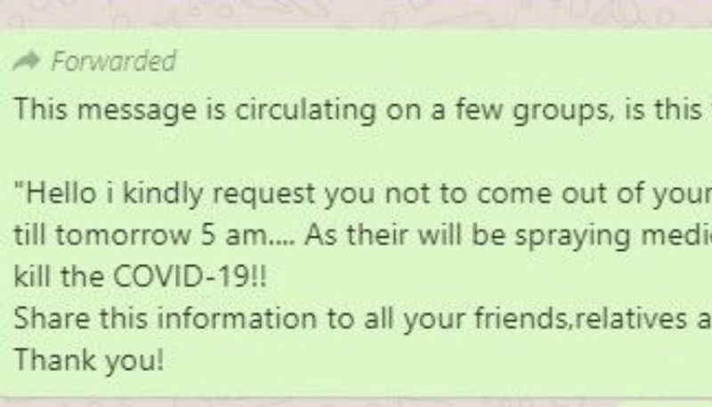 മുംബൈ, ബെംഗളൂരു അടക്കമുള്ള വന് നഗരങ്ങളില് പ്രചരിച്ച വ്യാജ സന്ദേശമിങ്ങനെ. 'രാത്രി 10 മുതല് രാവിലെ അഞ്ച് മണിവരെ ആരും പുറത്തിറങ്ങരുത്, വീടുകളില് തന്നെ കഴിയുക. കൊവിഡ് 19 വൈറസുകളെ കൊല്ലാന് സർക്കാർ മരുന്ന് തളിക്കുന്നുണ്ട്. പരമാവധി സുഹൃത്തുക്കള്ക്കും ബന്ധുക്കള്ക്കും കുടുംബങ്ങള്ക്കും ഈ സന്ദേശമെത്തിക്കുക'. ബെംഗളൂരു നിവാസികളെ അഭിസംബോധന ചെയ്ത് പ്രത്യേകം വാട്സാപ്പ് സന്ദേശവുമുണ്ടായിരുന്നു.