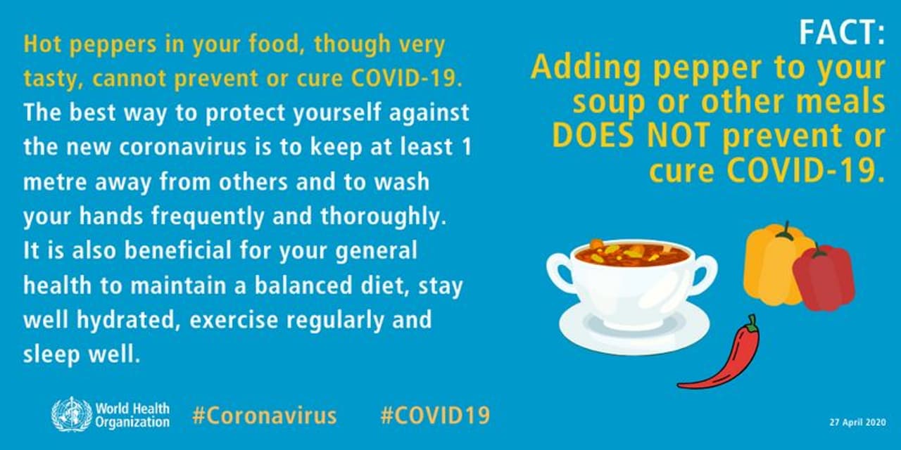 എന്നാല്, കുരുമുളകിന് കൊവിഡ് മാറ്റാനുള്ള ദിവ്യശക്തിയൊന്നും ഇല്ലായെന്ന് ലോകാരോഗ്യ സംഘടന വ്യക്തമാക്കി. 'കുരുമുളക് ചേര്ത്ത ഭക്ഷണം രുചികരമാണെങ്കിലും കൊവിഡിന് പ്രതിരോധമോ മരുന്നോ ആകില്ല. കൊവിഡിനെ പ്രതിരോധിക്കാന് ഏറ്റവും ഫലപ്രദമായ മാര്ഗം ആളുകള് തമ്മില് കുറഞ്ഞത് ഒരു മീറ്റര് അകലമെങ്കിലും പാലിക്കുന്നതും കൈകള് തുടര്ച്ചയായി കഴുകുന്നതുമാണ്' എന്ന് WHO വ്യക്തമാക്കി.