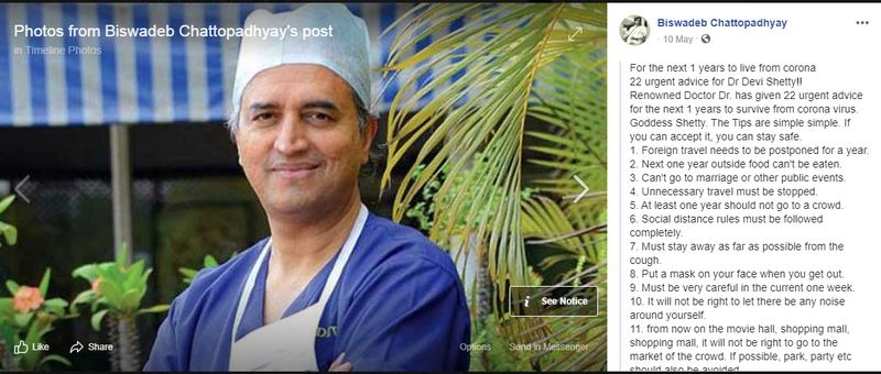 കൊവിഡിനെ പ്രതിരോധിക്കാന് പ്രശസ്ത ഹൃദയ ശസ്ത്രക്രിയാ വിദഗ്ധന് ഡോ. ദേവി പ്രസാദ് ഷെട്ടി മുന്നോട്ടുവെക്കുന്ന 22 നിര്ദേശങ്ങള് എന്ന പേരിലാണ് പോസ്റ്റ് പ്രചരിക്കുന്നത്