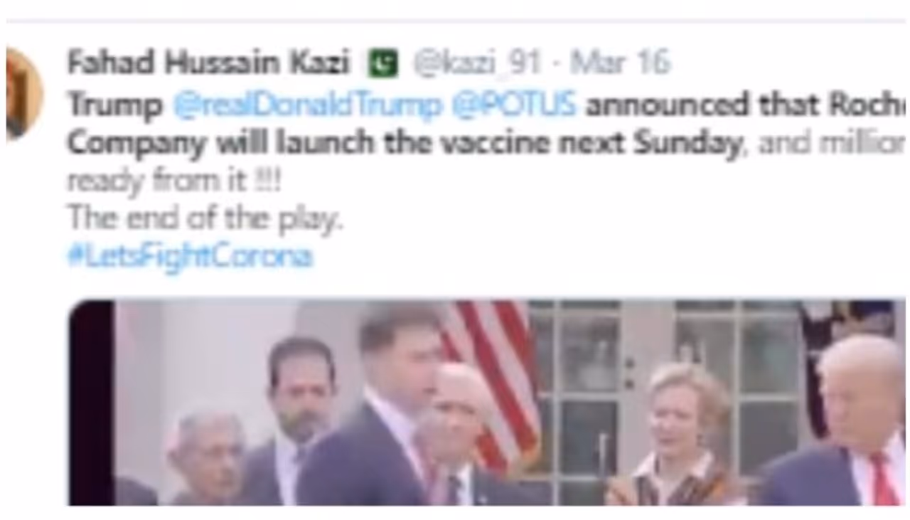 വൈറ്റ് ഹൌസിലെ പത്രസമ്മേളനത്തില് ട്രംപ് റോഷ് ഡയഗനേസ്റ്റിക്സ് പ്രസിഡന്റ് മാറ്റ് സോസിനെ വേദിയിലേക്ക് വിളിക്കുകയും അദ്ദേഹം കൊവിഡ് പരിശോധനക്ക് വേഗത്തില് അനുമതി നല്കിയതിന് നന്ദി പറയുന്നതുമാണ് വേദിയില് നടന്നത്. എന്നാല് റോഷ് മെഡിക്കല് കമ്പനി വാക്സിന് നിര്മാണം തുടങ്ങിയെന്നും അടുത്ത ഞായറാഴ്ചയോടെ ദശലക്ഷണക്കണക്കിന് ഡോസ് തയ്യാറാകുമെന്നുമാണ് വ്യാജ വാര്ത്തയില് പറയുന്നത്.