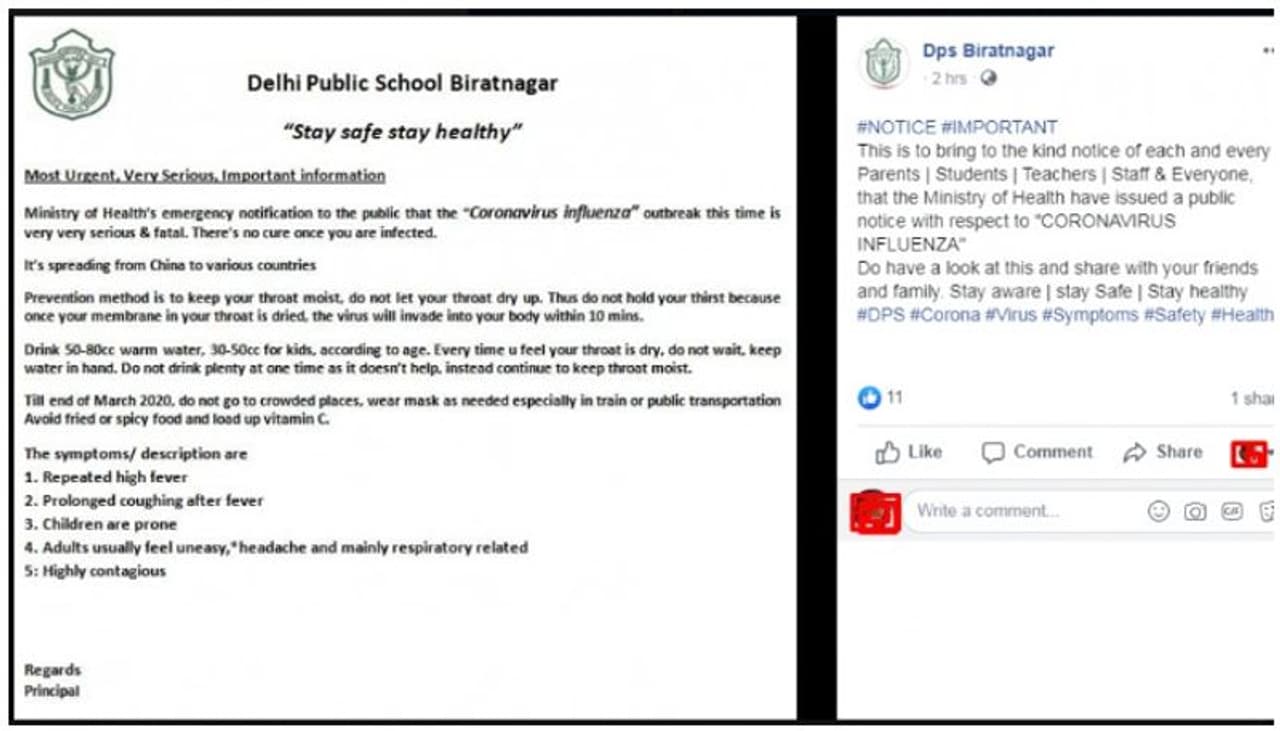 ഈര്പ്പമുള്ള സാഹചര്യങ്ങള് ഒഴിവാക്കുക, 2020 മാര്ച്ച് 20 അവസാനം തിരക്കുള്ള പൊതു സ്ഥലത്ത് നിന്ന് കഴിയുന്നതും ഒഴിഞ്ഞുനില്ക്കണമെന്നുമാണ് അറിയിപ്പില് പറയുന്നത്. ട്രെയിന്, തിയറ്റര് എന്നിവിടങ്ങളില് പോകുമ്പോള് മാസ്ക് ധരിക്കണമെന്നും പറയുന്നു. ജനുവരി 28നാണ് പ്രചാരണം തുടങ്ങിയത്. ദില്ലി പബ്ലിക് സ്കൂള് ബിരത്നഗര് അവരുടെ ഫേസ്ബുക്ക് പേജില് വ്യാജ അറിയിപ്പുകള് ഷെയര് ചെയ്തു. ഇതിന് പുറമെ, വ്യാജപ്രചാരണം വാട്സ് ആപ് ഇന് കയോ എന്ന ഗ്രൂപ്പിലാണ് പ്രചാരണം നടക്കുന്നു.