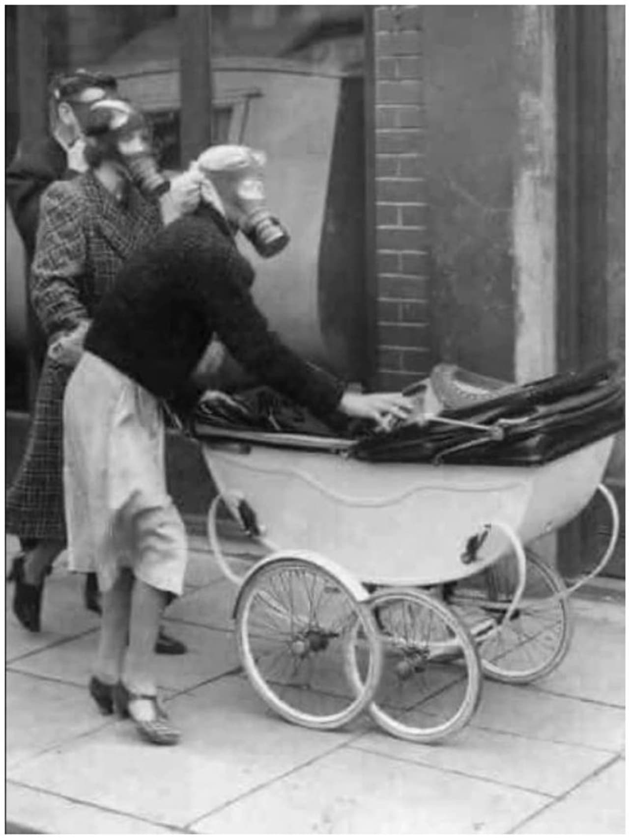 " 1941 ജൂൺ 9 . കിങ്സ്റ്റണിൽ നടന്ന അപ്രതീക്ഷിത ഗ്യാസ് റെസ്റ്റിനിടെ തന്റെ കുഞ്ഞിനെ പ്രാമിൽ ഇരുത്തി തള്ളിക്കൊണ്ട് പോകുന്ന ഗ്യാസ് മാസ്ക് അണിഞ്ഞ അമ്മ." എന്നാണ് ക്യാപ്ഷൻ പറയുന്നത്. Photo Credits: Keystone/Getty Images.