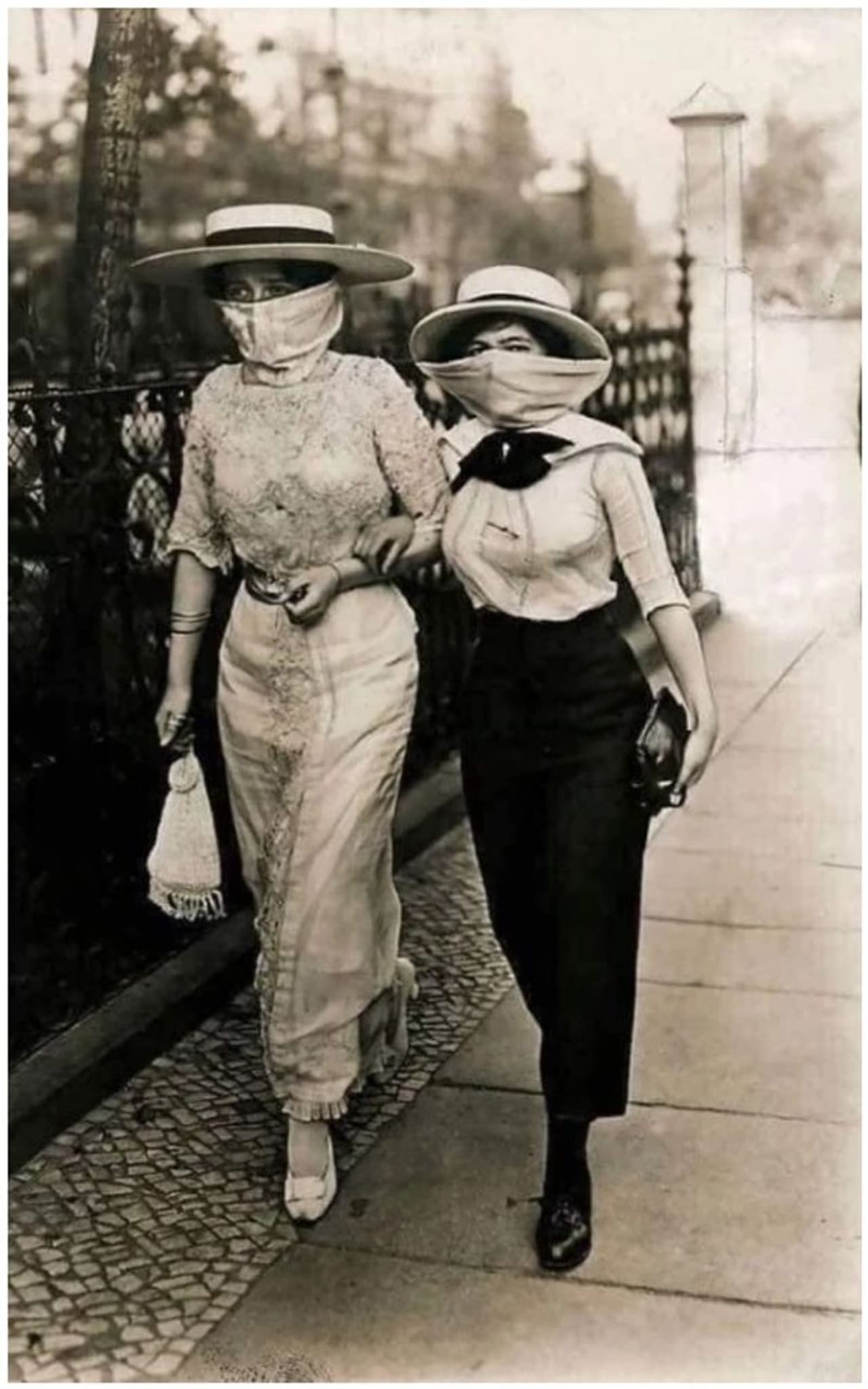 നാല് ചിത്രങ്ങൾ. നാലിലും വ്യത്യസ്തമായ നാലുതരം മാസ്കുകൾ ധരിച്ച് പൊതുഇടങ്ങളിൽ നടക്കുന്ന സ്ത്രീകൾ. ഗ്യാസ് മാസ്കുകൾ, വളരെ വിചിത്രമായ ഡിസൈനോട് കൂടിയ ചില മുഖാവരണങ്ങൾ എന്നിവ ഈ ചിത്രങ്ങളിൽ കാണാം. കൊവിഡ് 19 മഹാമാരിയോടുള്ള പ്രതിരോധത്തിന്റെ ഭാഗമായി ഇന്ന് ലോകമെമ്പാടും നടപ്പിലാക്കിക്കൊണ്ടിരിക്കുന്ന ' പുറത്തിറങ്ങുമ്പോൾ മാസ്ക് നിർബന്ധം' എന്ന പരിപാടി ഒരു നൂറ്റാണ്ടു മുന്നേ ഉണ്ടായിരുന്നു എന്ന് സ്ഥാപിക്കലാണ് ഈ പ്രചാരണത്തിന്റെ ഉദ്ദേശ്യം.