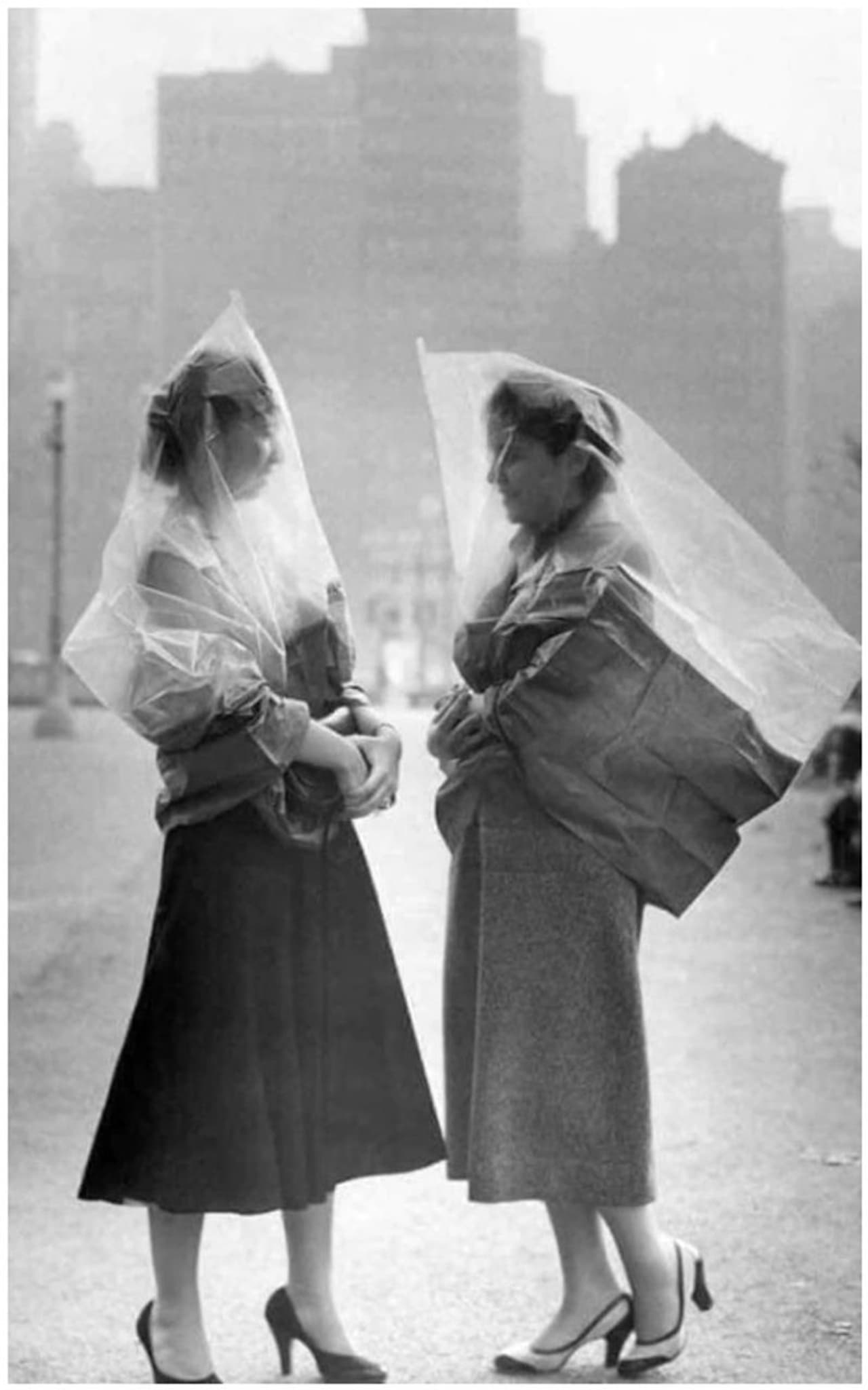 ഈ ചിത്രം പകർത്തപ്പെട്ടിരിക്കുന്നത് 1953 കാലത്തെ ഫിലാഡൽഫിയയിൽ വെച്ചാണ്. ഈ ചിത്രത്തിന്റെ ആധികാരികമായ ഒരു കോപ്പി ഞങ്ങൾ പല വെബ്സൈറ്റുകളുടെയും ഫോട്ടോ ഗ്യാലറിയിൽ കണ്ടെത്തിയിട്ടുണ്ട്. ക്യാപ്ഷൻ ഇങ്ങനെ " യുദ്ധകാലത്ത് ബാക്കി വന്ന ഗ്യാസ് മാസ്കുകൾ അണിഞ്ഞു നിൽക്കുന്ന മെറിയൽ ബുഷ്, റൂത്ത് ന്യൂവർ എന്നിവർ. തുടർച്ചയായ രണ്ടാം ദിനവും ഫിലാഡൽഫിഎയുടെ തെരുവുകളിൽ പടർന്ന സ്മോഗ് കാരണമുണ്ടാകുന്ന കണ്ണെരിച്ചിലിൽ നിന്ന് രക്ഷപ്പെടാൻ യുവതികൾ സ്വീകരിച്ച മാർഗം.