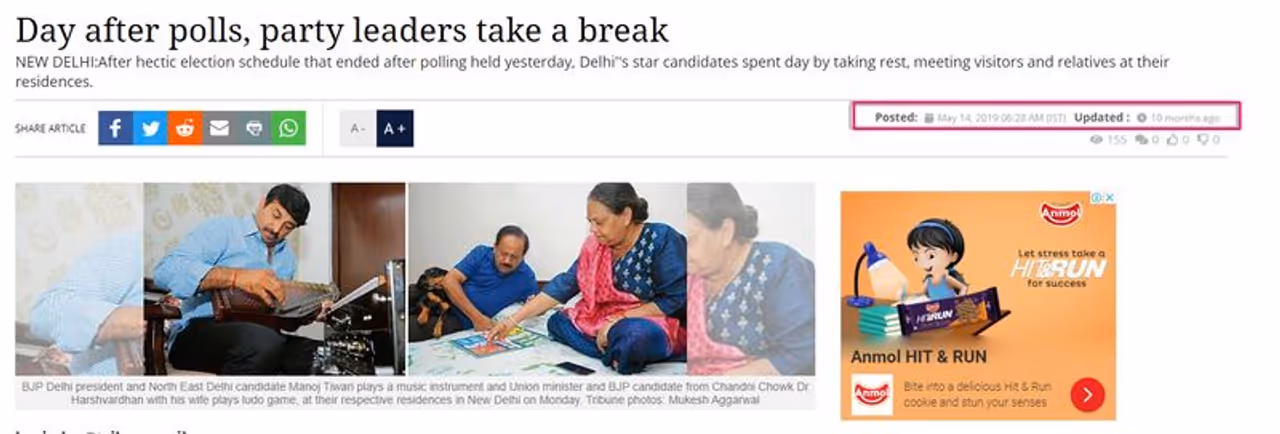 എന്നാല് ഈ ചിത്രത്തിന്റെ യാഥാര്ത്ഥ്യം തേടി ഈ ചിത്രം റിവേഴ്സ് സെര്ച്ച് നടത്തിയാല് ലഭിക്കുന്ന ഫലം മെയ് 14, 2019 ലെ ട്രൈബ്യൂണിന്റെ വാര്ത്തയാണ്. ഇത് പ്രകാരം ഈ ചിത്രം കഴിഞ്ഞ വര്ഷം മെയ് മാസത്തിലുള്ളതാണ്. ദില്ലിയില് ലോക്സഭ തെരഞ്ഞെടുപ്പിന് ശേഷം പ്രവര്ത്തനങ്ങളില് നിന്നും ഇടവേളയെടുത്ത ബിജെപി നേതാക്കള് ഒഴിവ് സമയം ആസ്വദിക്കുന്നു എന്നതാണ് വാര്ത്തയുടെ ഉള്ളടക്കം. ഇത് വച്ചാണ് ഇപ്പോള് ലോക്ക്ഡൗണ് കാലത്ത് കേന്ദ്ര ആരോഗ്യമന്ത്രി ലുഡോ കളിക്കുന്നു എന്ന വാര്ത്ത വരുന്നത്.