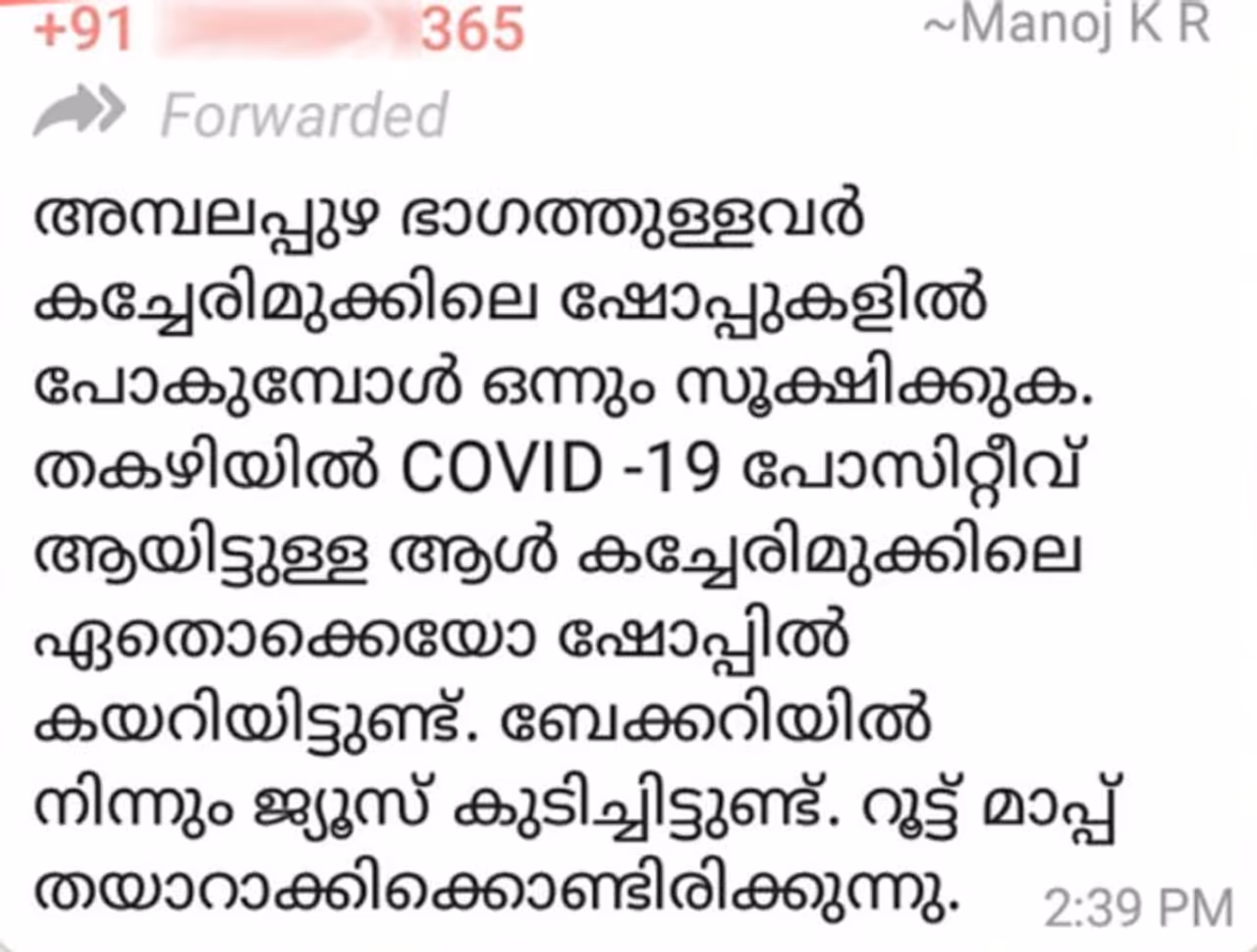 'അമ്പലപ്പുഴ ഭാഗത്തുള്ളവര് കച്ചേരിമുക്കിലെ ഷോപ്പുകളില് പോകുമ്പോള് ഒന്ന് സൂക്ഷിക്കുക. തകഴിയില് കൊവിഡ് 19 പോസിറ്റീവ് ആയിട്ടുള്ള ആള് കച്ചേരിമുക്കിലെ ഏതൊക്കയോ ഷോപ്പില് കയറിയിട്ടുണ്ട്. ബേക്കറിയില് നിന്നും ജ്യൂസ് കുടിച്ചിട്ടുണ്ട്. റൂട്ട് മാപ്പ് തയ്യാറാക്കിക്കൊണ്ടിരിക്കുന്നു'. ഇതാണ് വ്യാപകമായി പ്രചരിക്കുന്ന സന്ദേശത്തില് പറയുന്നത്.