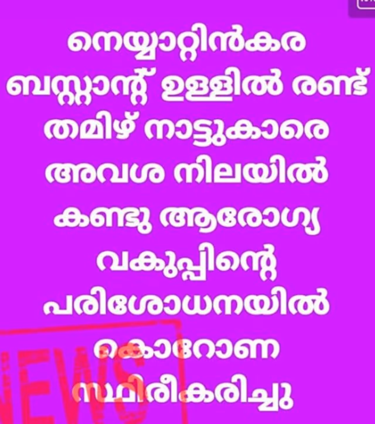 'നെയ്യാറ്റിന്കര ബസ്റ്റാന്ഡിനുള്ളില് രണ്ട് തമിഴ്നാട്ടുകാരെ അവശനിലയില് കണ്ടു. ആരോഗ്യ വകുപ്പിന്റെ പരിശോധനയില് കൊറോണ സ്ഥിരീകരിച്ചു'.